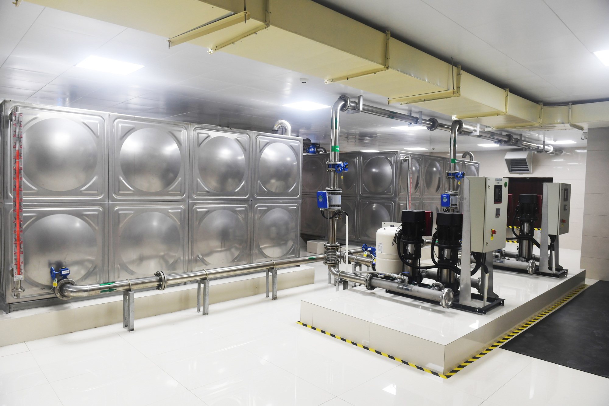 圖:咸寧聯(lián)合水務二次供水標準化泵房 泵房內(nèi)兩個32立方米和64立方米超大水箱互為備用、交替供水,當一個水箱清洗消毒時,另一個水箱可持續(xù)供水,水箱旁的兩臺紫外線消毒裝置每小時可對120立方米水進行消毒處理,配合實時在線水質(zhì)偵測系統(tǒng),如發(fā)現(xiàn)水質(zhì)指標接近限值前,向中控平臺發(fā)出水質(zhì)預報警,提醒工作人員及時處理,從而保障居民飲水安全。 二次供水標準化泵房如何管理? 為有效保障城市二次供水安全,咸寧聯(lián)合水務有限公司對內(nèi)制定了嚴格的規(guī)章制度,公司從事二次供水衛(wèi)生管理和清潔維修人員必須進行健康體檢,取得健康證明后方可上崗工作。另外,每次清洗水箱后,二次供水的水樣都會委托專業(yè)檢測機構(gòu)——咸寧市香泉水質(zhì)檢測有限公司(已取得省級CMA資質(zhì)認定證書)對水質(zhì)進行檢測,在24小時后出具水質(zhì)檢測報告遞送給小區(qū)物業(yè)進行公布,自覺接受廣大居民朋友的監(jiān)督。