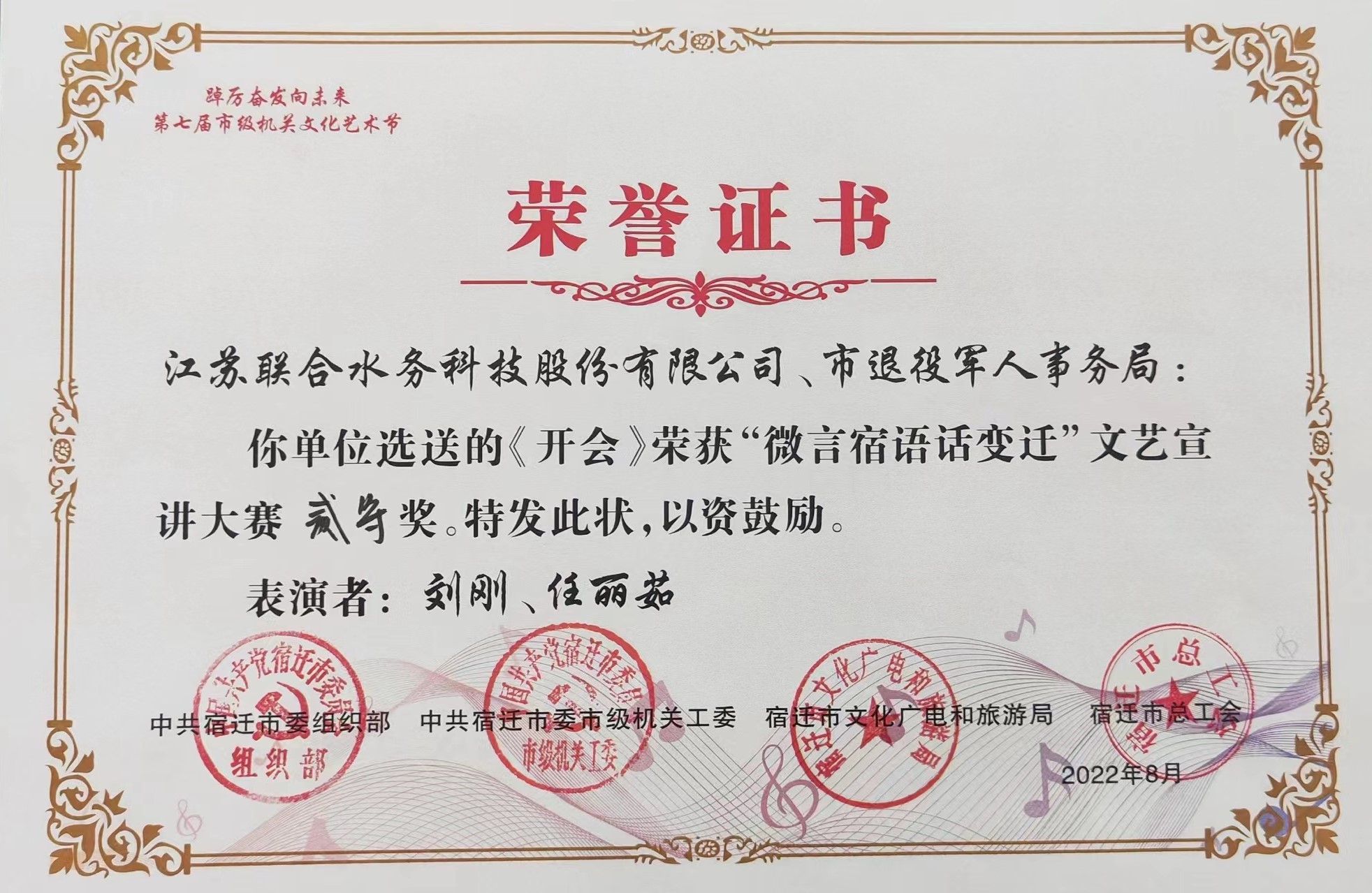 近日,一場精彩的文藝宣講大賽在宿遷市文化館的小劇場拉開了帷幕,由宿遷市委組織部、市級機關工委、文化和廣電旅游局和市總工會主辦的第七屆市級機關文化節在這里隆重舉行,共23個單位28個節目300多位演員在這里緊張角逐,最終江蘇聯合水務科技股份公司宿遷供水公司精心打造的節目——快板書《開會》奪得比賽二等獎。