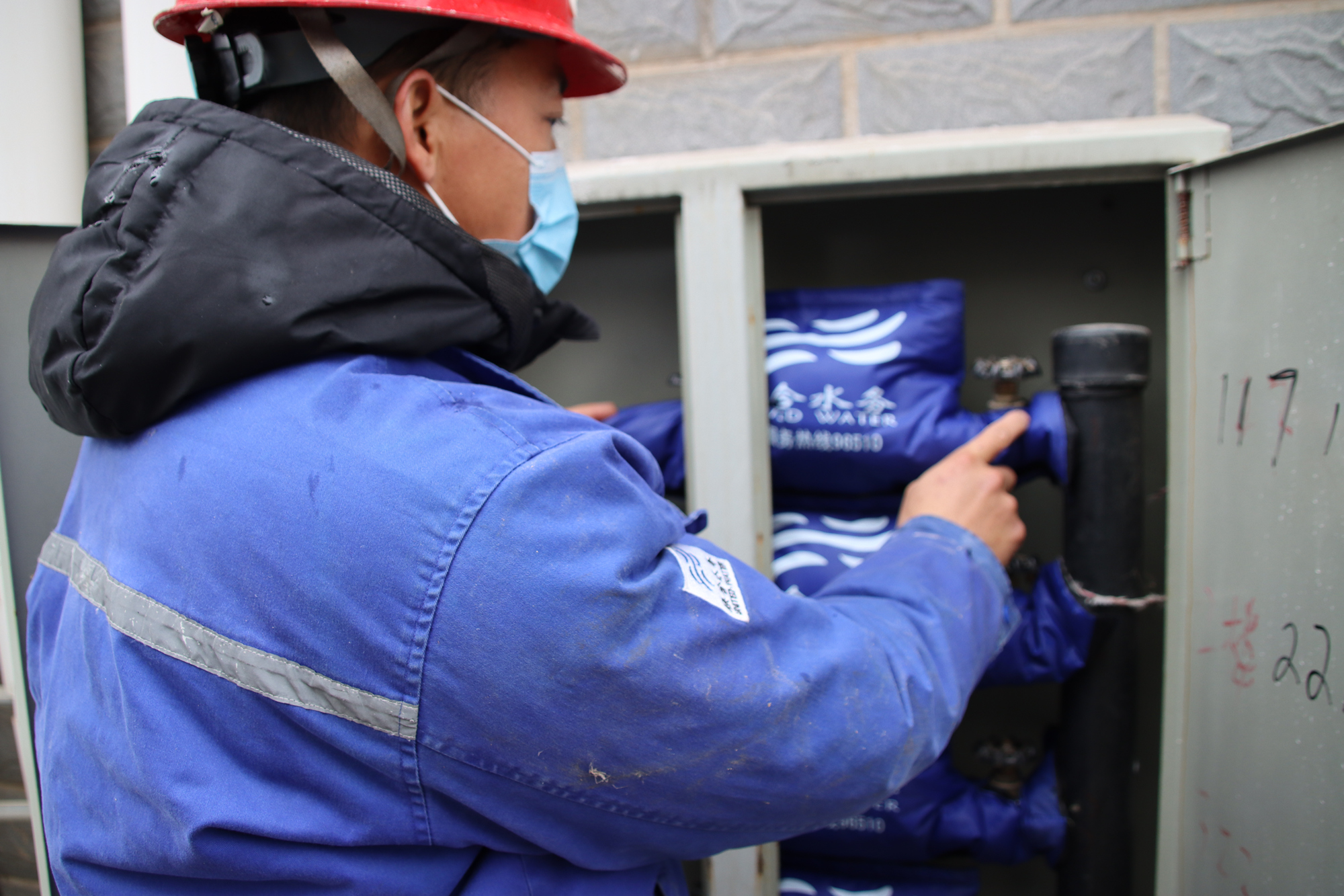 按照咸寧聯合水務冬季防凍保供水專題會議相關要求,11月28日,公司溫泉管網分部和永安管網分部抽調專人開展戶外水表“穿衣戴帽”行動。在高新區管委會宿舍外的水表箱旁,咸寧聯合水務的工作人員先是打開墻上水表箱外的門鎖,檢查泡沫保溫層和水表是否完好,對之前保溫材料老化、缺失的部位進行了包扎和填充,最后用定制的水表防護罩,逐一給外露的水表進行包裹,包裹完成后,工作人員也會再次進行檢查,通過觸摸、拉扯等動作確保每個水表部位都被緊緊包裹,最后鎖好水表箱,至此,給水表箱“穿衣帶帽”行動才算完成。