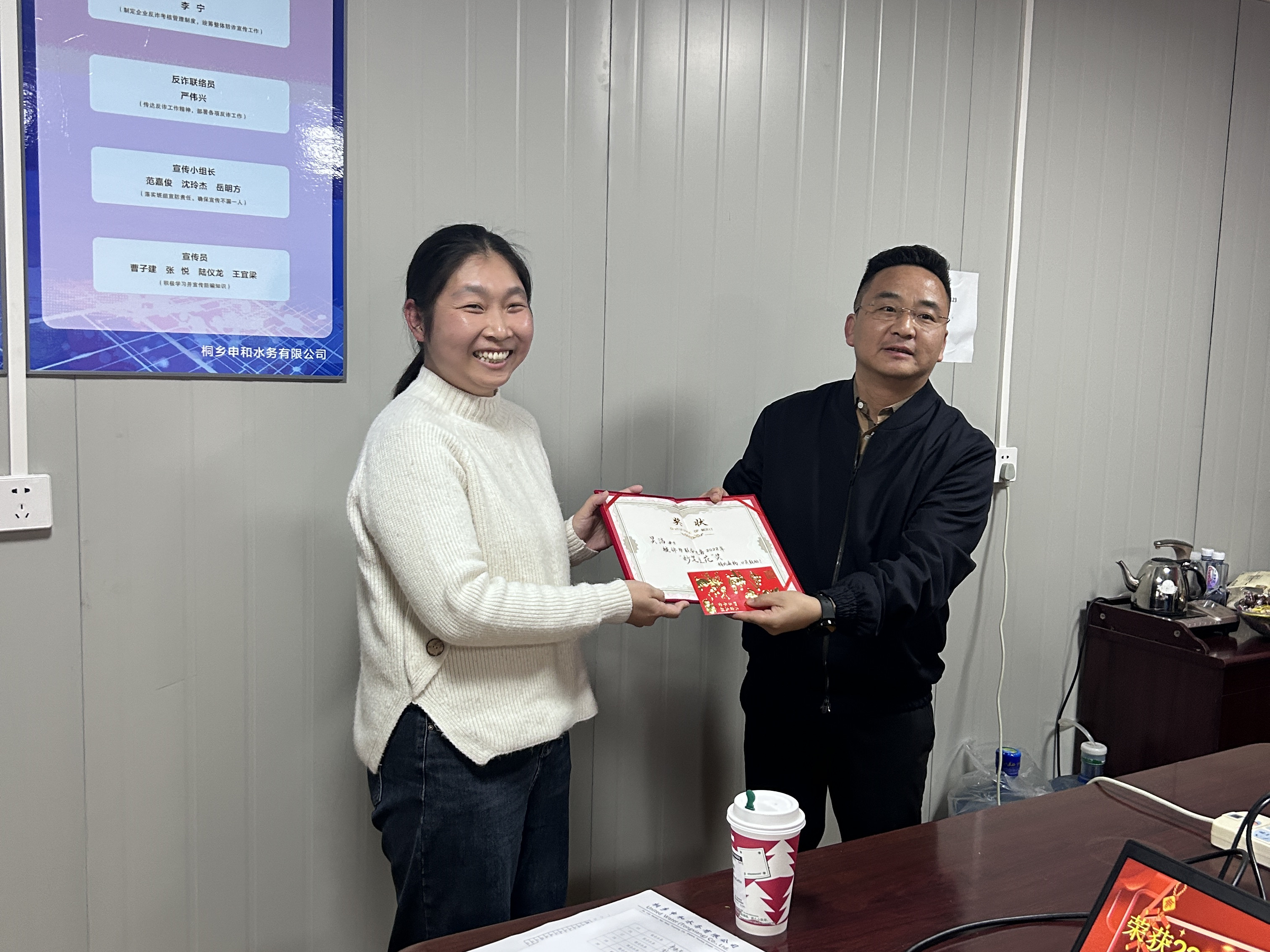 圖:羅總為吳潔頒獎(jiǎng) 會(huì)議隨著高級(jí)副總裁陳樵的精彩致辭迎來(lái)高潮。陳總表示,桐鄉(xiāng)作為聯(lián)合水務(wù)奮勇發(fā)展的中堅(jiān)力量,始終錨定目標(biāo),接續(xù)奮斗,匯聚了干事創(chuàng)業(yè)的強(qiáng)大合力。今年,公司涌現(xiàn)出一批工齡高達(dá)15年的優(yōu)秀員工,為此,他代表公司向?qū)⑶啻悍瞰I(xiàn)給公司的老員工們致以最誠(chéng)摯的感謝,希望他們保持對(duì)公司的熱忱,跟隨公司的腳步,乘勢(shì)而上。隨后,陳總代表公司為他們頒發(fā)了榮譽(yù)證書(shū)。 最后,聯(lián)合水務(wù)高級(jí)副總裁兼桐鄉(xiāng)公司總經(jīng)理羅斌作工作總結(jié),羅總從公司管理層的人員調(diào)整、安全生產(chǎn)、達(dá)標(biāo)提標(biāo)等方面進(jìn)行了全面回顧,并對(duì)2023年公司的穩(wěn)步發(fā)展做出展望。羅總表示,2023年是充滿希望的一年,公司全體員工勠力同心定能高效完成既定工作目標(biāo),開(kāi)創(chuàng)公司發(fā)展新局面。