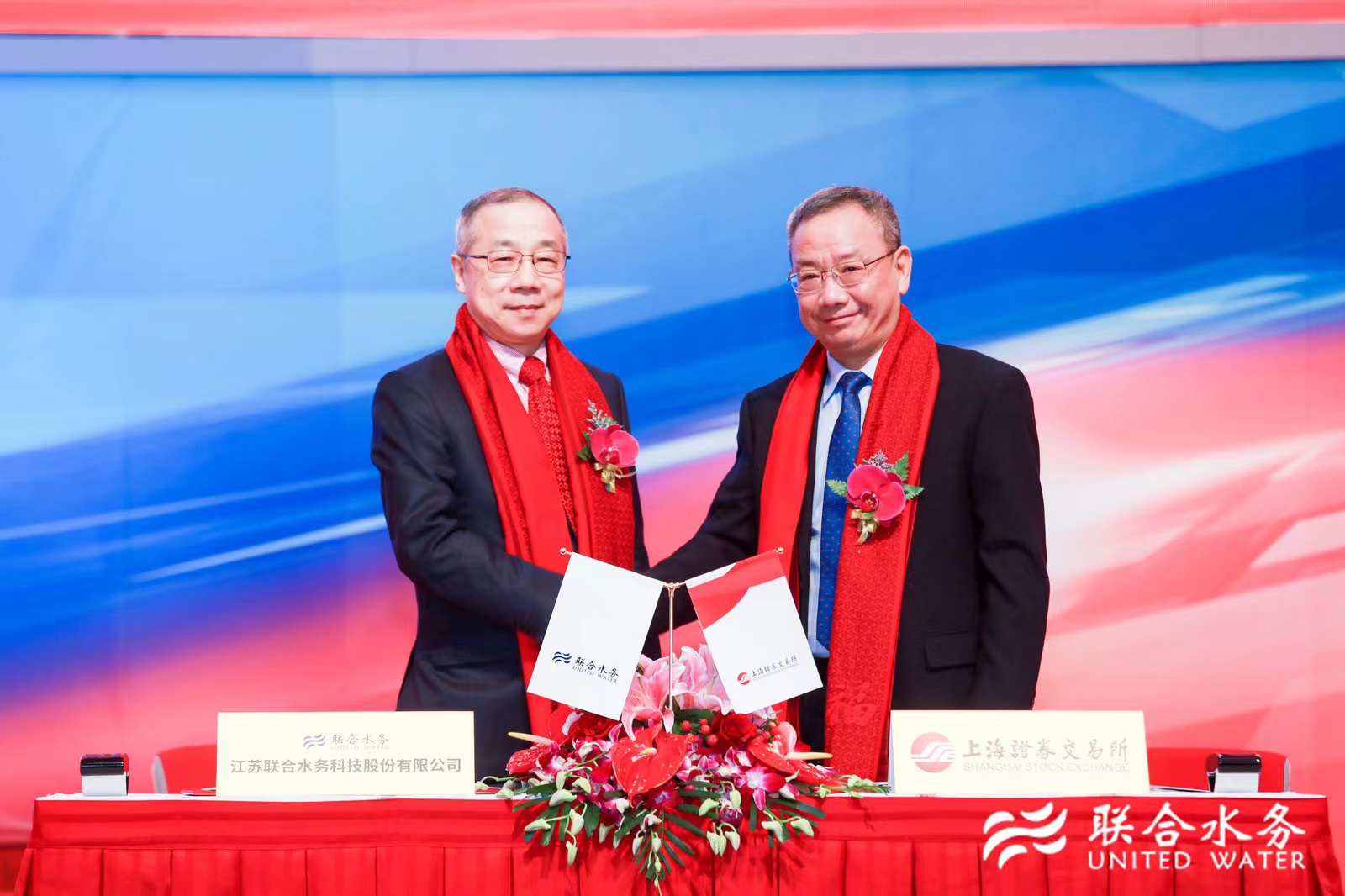 董事長兼總裁俞偉景在儀式上致辭 儀式上,聯合水務董事長兼總裁俞偉景與上海證券交易所黨委委員、副總經理董國群簽訂了《上市協議書》。