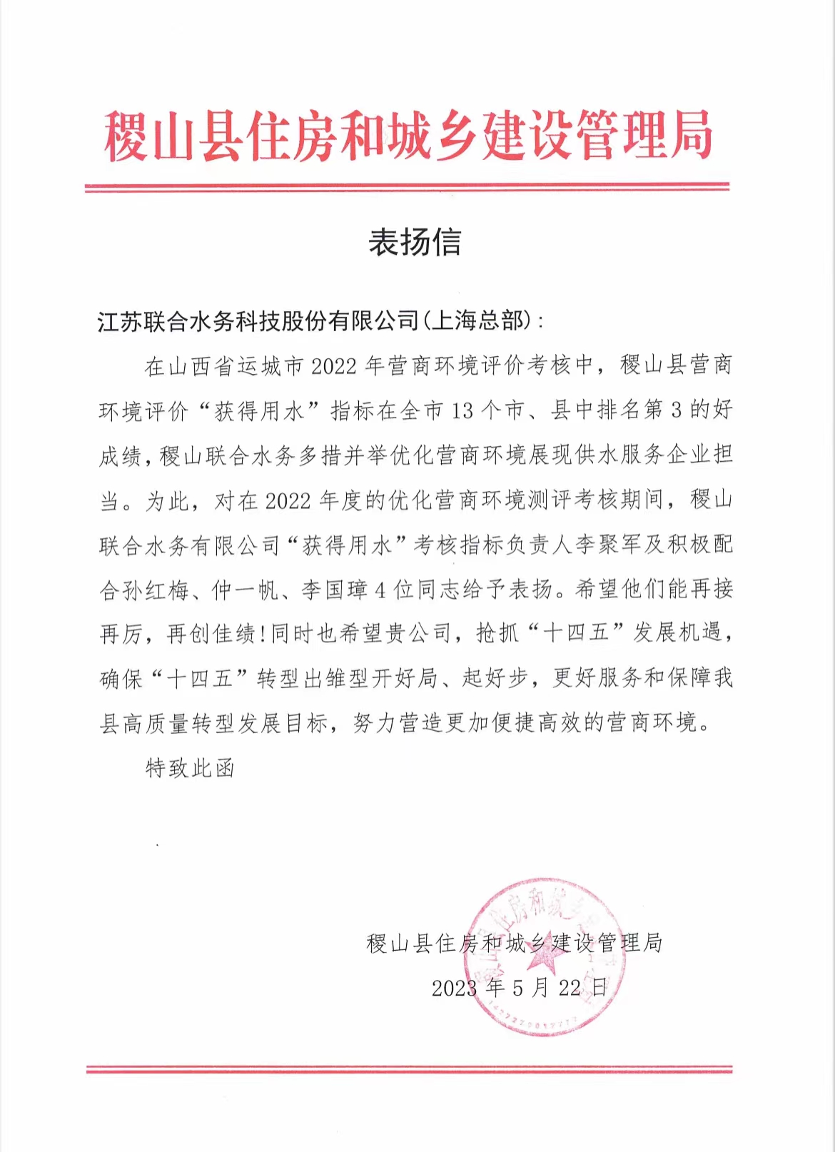 近日,山西省稷山縣住房和城鄉(xiāng)建設(shè)局向聯(lián)合水務(wù)發(fā)來一封表揚(yáng)信,充分肯定了江蘇聯(lián)合水務(wù)科技股份有限公司旗下全資子公司稷山聯(lián)合水務(wù)有限公司在優(yōu)化營商環(huán)境方面所采取的多項舉措,贊揚(yáng)其追求卓越,以高度責(zé)任感展現(xiàn)了供水服務(wù)企業(yè)擔(dān)當(dāng),信中特別表揚(yáng)了稷山公司“優(yōu)化營商”小組成員,包括客戶服務(wù)經(jīng)理李聚軍、客戶服務(wù)部副經(jīng)理孫紅梅、管網(wǎng)部經(jīng)理仲一帆、項目部經(jīng)理李國璋,希望他們能再接再厲,再創(chuàng)佳績!