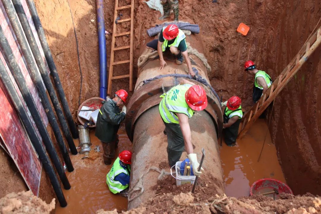 無懼“高”溫,做好應急搶修 夏季作為一年之中的用水高峰期,季節的特殊性使得管道爆管、漏水現象發生頻率較高,供水管道搶修量比其他時間段明顯增加。7月12日,通江大道大屋吳附近DN1200mm供水管網因老化發生漏水,咸寧聯合水務多部門聯動火速趕赴現場了解情況,并迅速啟動應急搶修預案,第一時間緊急調配挖掘機、發電車、抽水機等大型搶修機具進行增援,安排應急搶修專班趕往事發現場,迅速開展現場勘察、確定漏點具體情況、設立全面安全防護措施等搶修前期工作。在搶修期間,面對管徑大、時間緊、施工作業環境復雜等諸多難題,搶修人員齊心配合、攻堅克難,井然有序地開展漏點測定、降水開挖、焊接維修、沖洗試壓等一系列搶修和恢復工作,天氣炎熱,施工人員早已汗流浹背,但他們不畏艱難酷暑,堅守崗位,歷經三十六個小時的晝夜奮戰,完美完成DN1200主管道的維修和保養,未對城區供水造成任何不良影響。