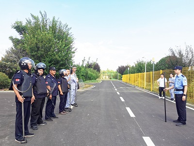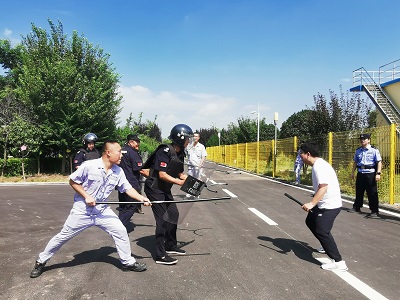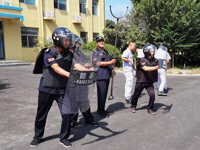 8月2日上午,三門峽公司的安保人員及生產運行人員在辦公樓前一字排開,禹王路派出所的民警向現場人員介紹了反恐防暴知識,講解防暴盾牌、防暴鋼叉、警用長棍等防暴器材在實戰過程中的正確使用方法,并現場教授了攻防技能和系列動作要領,F場人員在民警同志的指導下,3人一小組,反復練習防護盾牌與鋼叉的有效配合,為即將開始的模擬演練做準備。