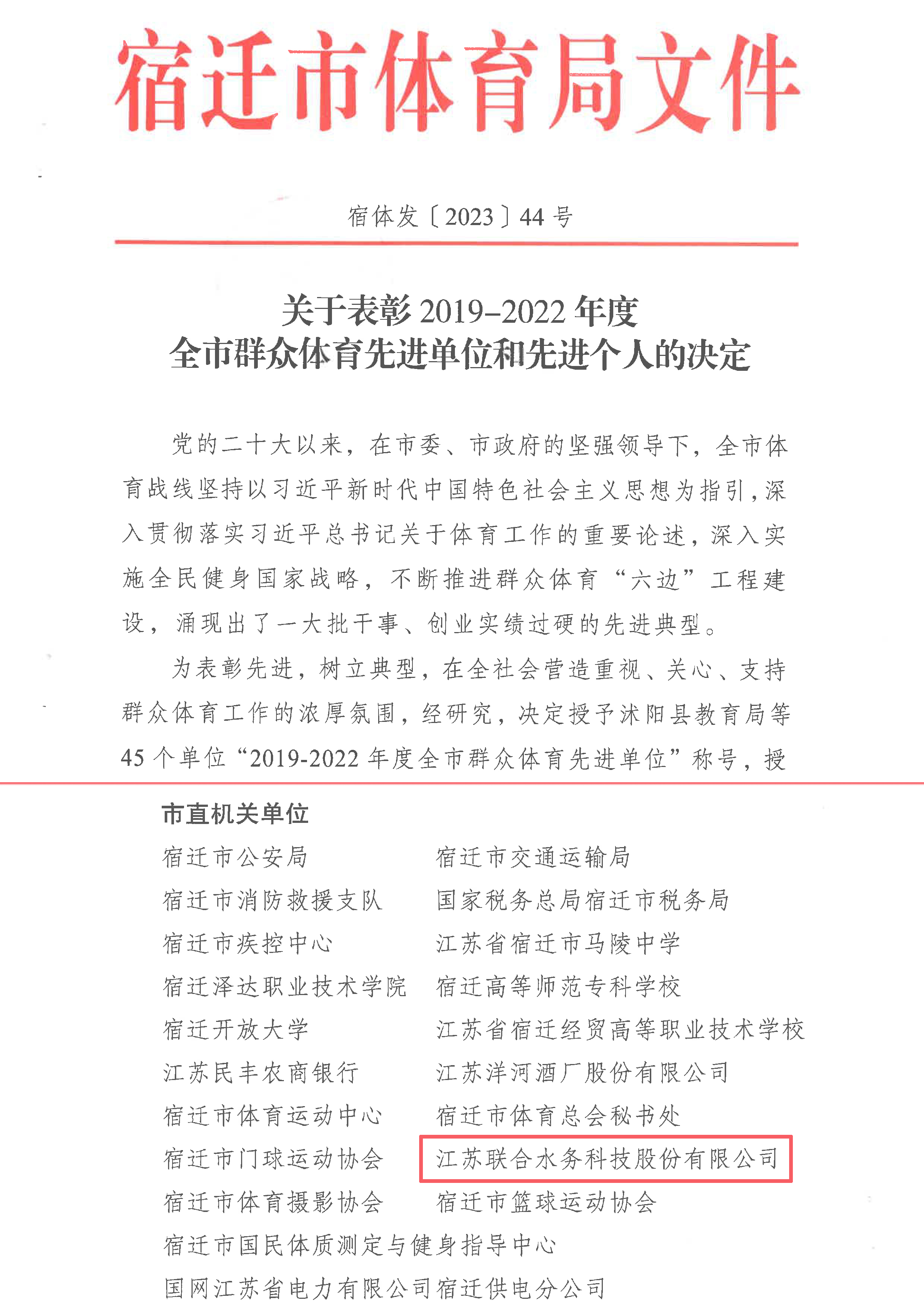 近日,宿遷市體育局發布《關于表彰2019-2022年度全市群眾體育先進單位和先進個人的決定》,江蘇聯合水務科技股份有限公司(下稱“聯合水務”)榮獲“全市群眾體育先進單位”稱號。