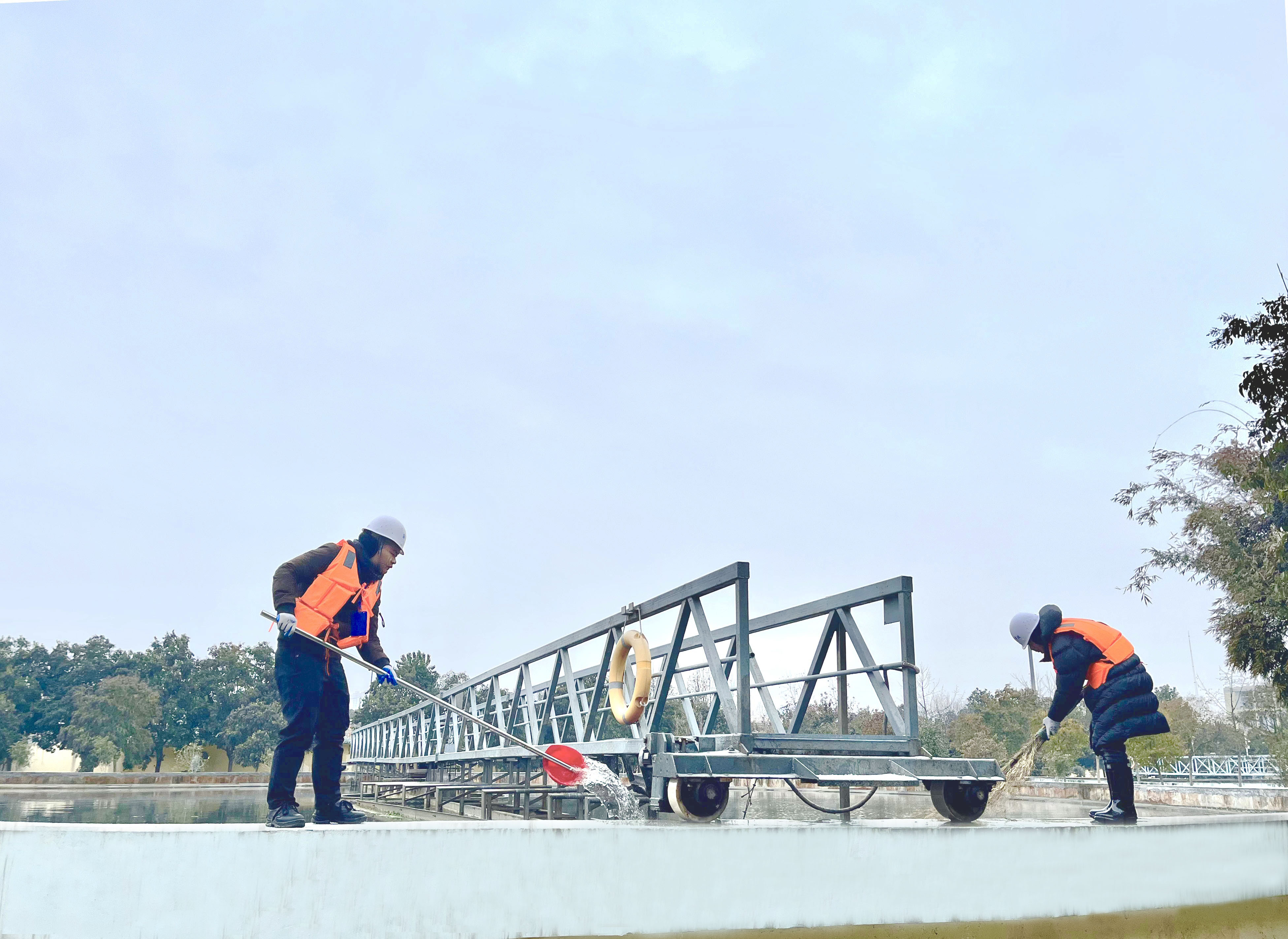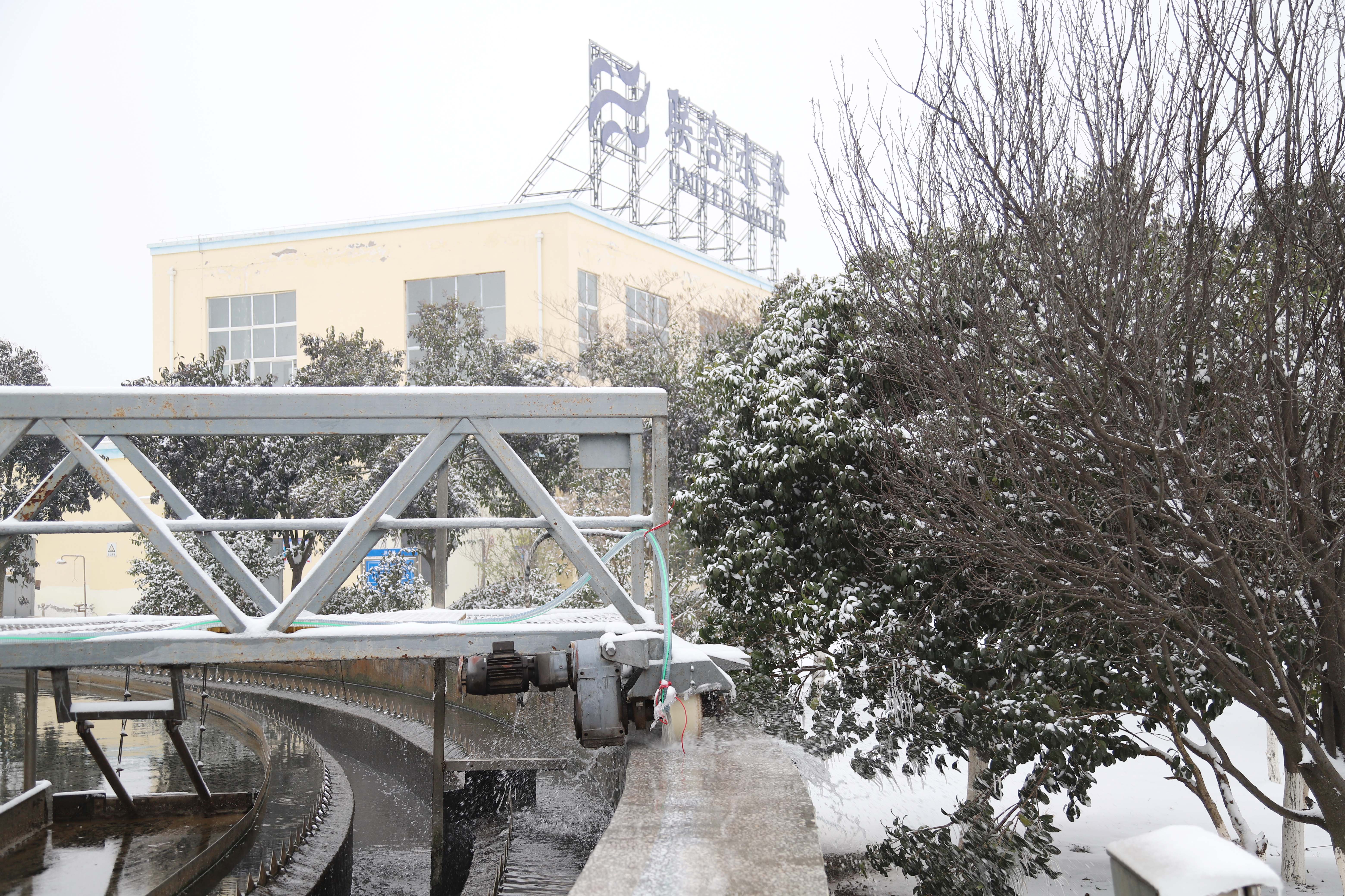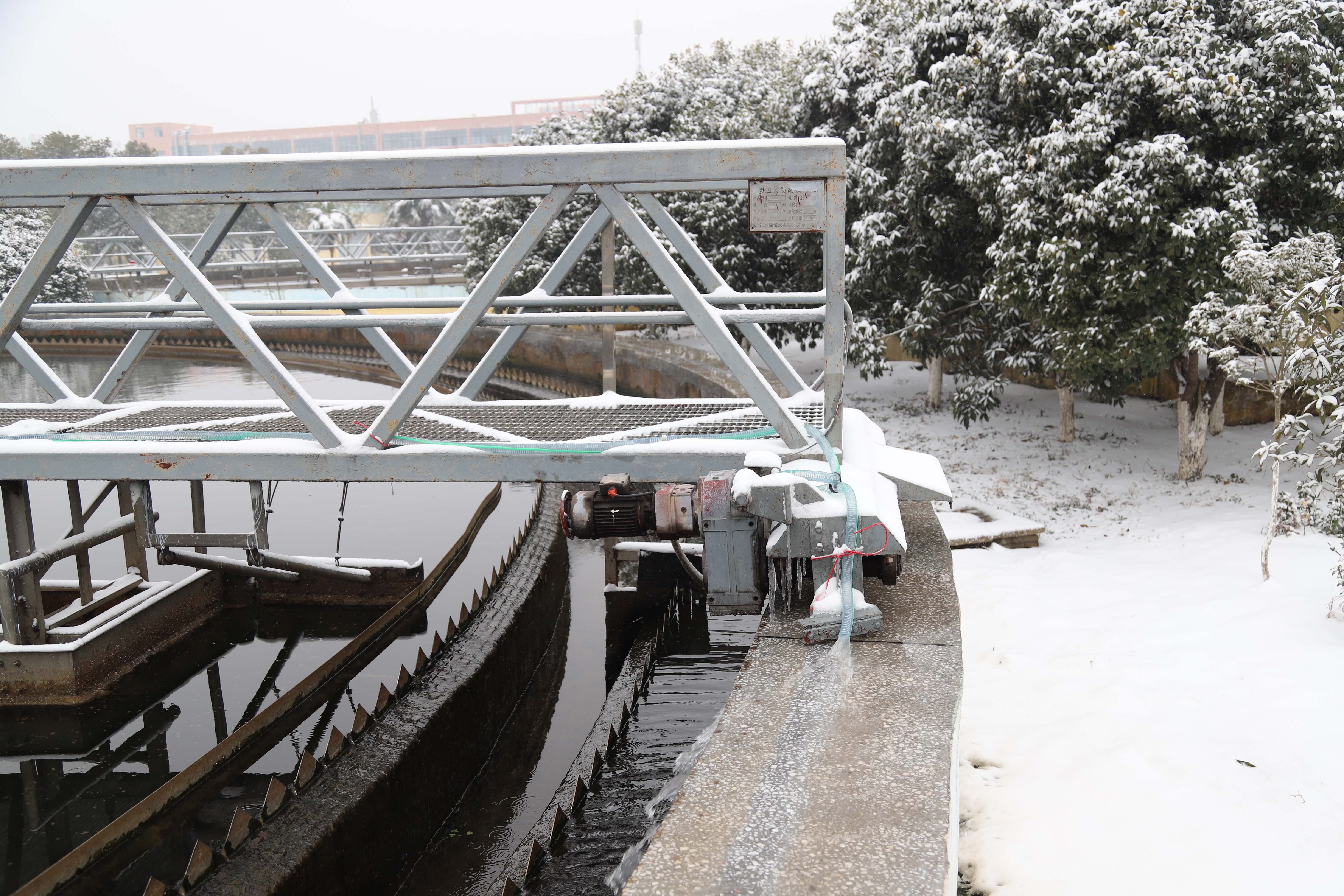 污水處理工作不僅關(guān)系著生態(tài)環(huán)境,也是關(guān)系著千家萬戶的民生大事,寒潮天氣下,隨州公司生產(chǎn)人員冒著風(fēng)雪進(jìn)行重點(diǎn)地巡檢,通過巡檢觀察污水處理廠各工藝單元的感官現(xiàn)象和指標(biāo),初步判斷水質(zhì)的變化和運(yùn)行是否正常、穩(wěn)定,重點(diǎn)設(shè)備是否正常運(yùn)行。在巡檢的過程中,生產(chǎn)人員發(fā)現(xiàn)一期四座二沉池下方輪子出現(xiàn)打滑空轉(zhuǎn),二沉池運(yùn)轉(zhuǎn)停止的情況。雪落在行走軌道上,被行走輪壓實(shí)后,形成雪層,造成行走輪的打滑,使刮泥機(jī)長時(shí)間在一個(gè)位置運(yùn)行,池底的污泥無法全部排出,造成工藝運(yùn)行的異常,需要及時(shí)清理干凈軌道表面的冰層。發(fā)現(xiàn)問題后,生產(chǎn)各部門緊急召開臨時(shí)會議,制定解決方案,最終決定安裝水泵,從池子抽水澆注在軌上道,保障軌道正常運(yùn)行。
