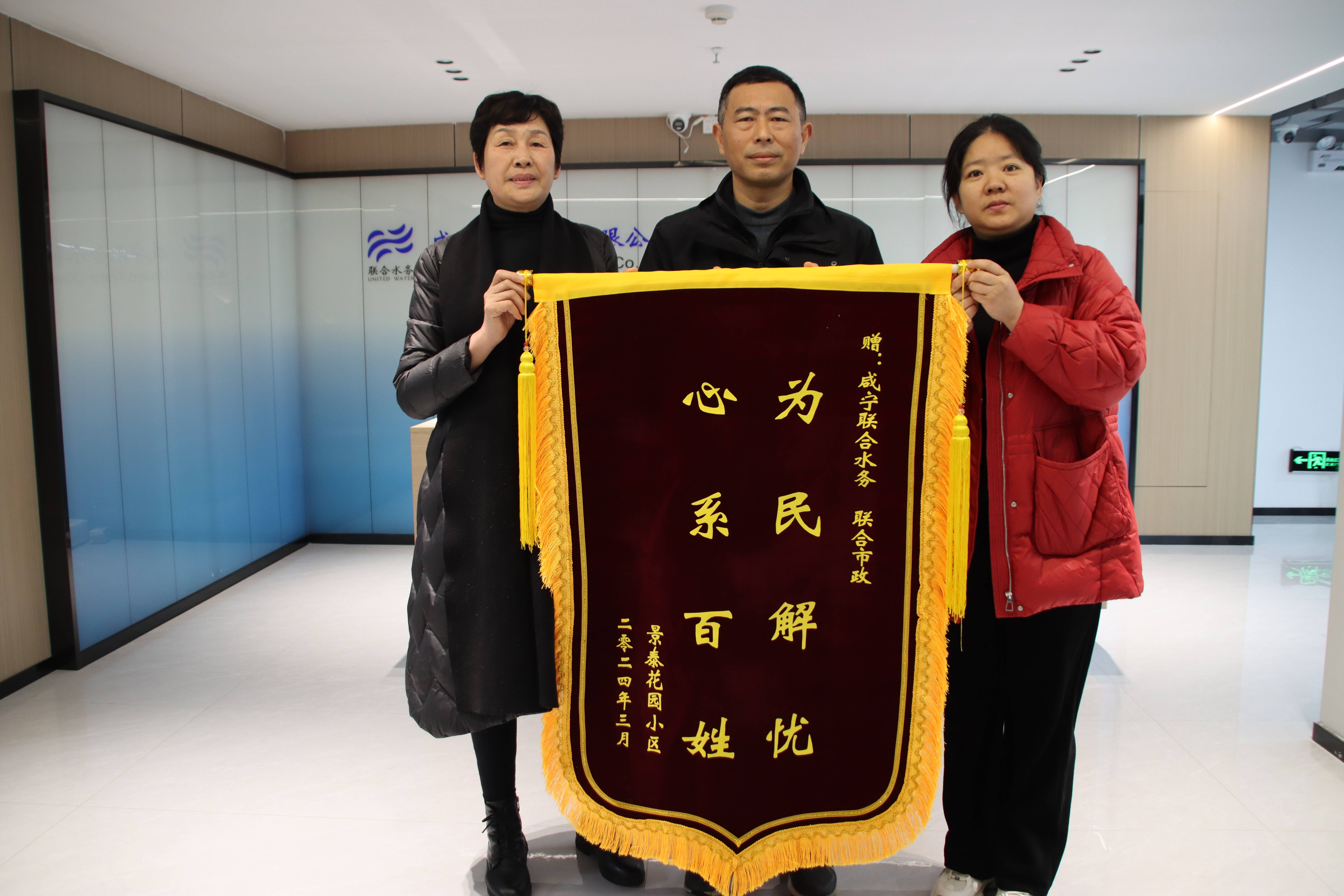 3月18日上午,湖北省咸安區景泰花園小區物業代表楊女士及業主代表專程將一面印著“為民解憂、心系百姓”的錦旗送到聯合水務集團運營管理中心管網總監兼咸寧區域管網副總經理夏維龍手中,對咸寧聯合水務有限公司、咸寧聯合市政工程有限公司積極上門服務、熱情解決居民實際用水問題表示感謝。