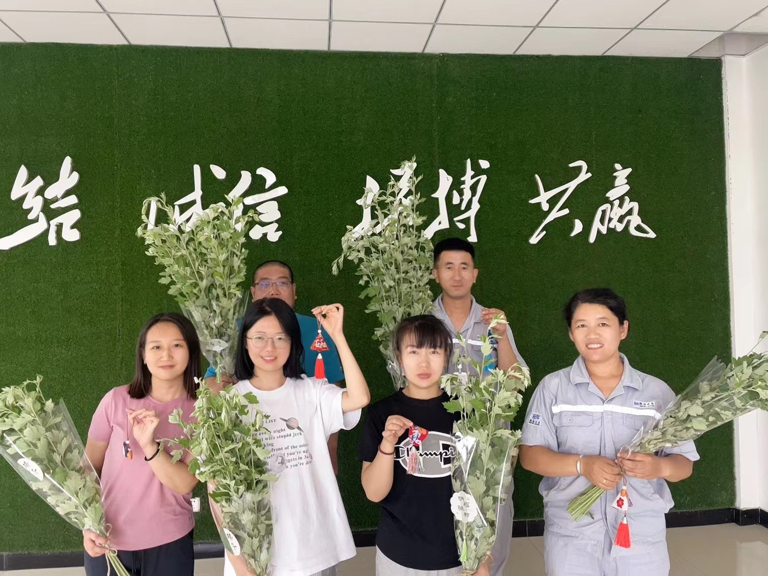 艾草花束 沒有一個(gè)節(jié)日的儀式感是一束花所給不了的,端午節(jié)也不例外。此次活動(dòng)大家就地取材,公司員工提前挖出園里的新鮮艾草、用剪刀修剪艾草的長(zhǎng)度和形狀,制造層次感。并將包裝紙裹在艾草根部,用麻繩固定。在花束上綁上各式的小卡片或小裝飾品。一束束飽含吉祥象征的端午花束就做好了。制作現(xiàn)場(chǎng)大家互幫互助互敬互贈(zèng),彼此將美好的祝福及心意連同花束一同贈(zèng)予。倒掛的艾草花束,傳遞出的是納福驅(qū)邪,祝福安康的美好寓意,也是團(tuán)隊(duì)協(xié)作之美的彰顯。