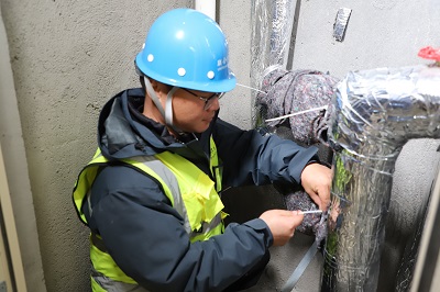 他是維修員張棟棟。背著沉重的工具包,他穿梭在大街小巷,寒風凜冽,腳步不歇,在狹小的管道井、在沒有電梯的樓梯間……他細致地檢查管道,包裹保溫材料,用腳步丈量責任,以實干詮釋擔當!懊恳粚拥乃硐,我們都要對保溫棉、表套等進行檢查,并做好記錄。遇到雨雪冰凍天氣,我們還會增派人員,加大巡檢力度。”寒潮來臨前,公司全體維修員不畏嚴寒,爭分奪秒,對小區管道井、水表箱進行全面檢查和維護,每一處細節都不放過,一旦出現供水故障,他們會迅速組織人員搶修,以最快速度恢復供水。 “您好,聯合水務宿遷供水公司,您請講!