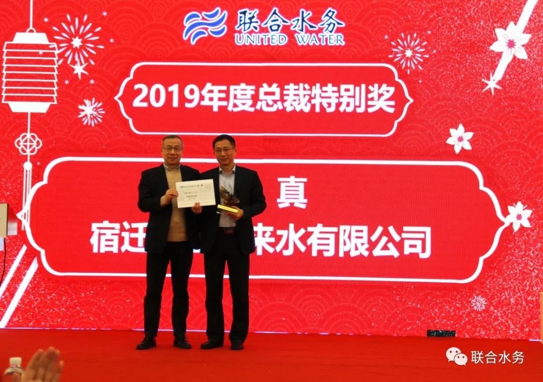 聯(lián)合水務(wù)集團(tuán)2020年年會現(xiàn)場 1月20日,聯(lián)合水務(wù)集團(tuán)2020年年會在咸寧碧桂園鳳凰溫泉國際酒店召開,上海集團(tuán)總部、各區(qū)域項(xiàng)目公司的帶頭人共計48名高層管理人員參加會議,總結(jié)2019、展望2020年,共商集團(tuán)發(fā)展大計。會議由集團(tuán)人力資源行政總經(jīng)理?xiàng)铥愊寂恐鞒帧8黜?xiàng)目公司、集團(tuán)各運(yùn)營模塊負(fù)責(zé)人分別作了2019年工作總結(jié)和新一年工作計劃匯報,集團(tuán)高級副總裁劉猛先生、陳樵先生、副總裁羅斌先生根據(jù)匯報對各自負(fù)責(zé)的華中區(qū)、華南區(qū)、北方區(qū)的重點(diǎn)工作和挑戰(zhàn)做了分析與計劃,向著更高的目標(biāo),不斷奮進(jìn)!2019年,宿遷銀控自來水有限公司為集團(tuán)營收、人才輸出、新項(xiàng)目建設(shè)等做出了突出貢獻(xiàn),總經(jīng)理曾真先生摘得“2019年聯(lián)合水務(wù)集團(tuán)總裁特別獎”桂冠。集團(tuán)董事長兼總裁俞偉景先生為曾總頒獎。榮譽(yù)是激勵,更是鞭策。曾真總經(jīng)理發(fā)表獲獎感言,感謝集團(tuán)領(lǐng)導(dǎo)對宿遷公司的關(guān)懷、感謝宿遷公司所有同仁的共同努力、感謝各兄弟公司的鼎力支持,并表示將一如既往,緊跟集團(tuán)發(fā)展步伐,當(dāng)好排頭兵。