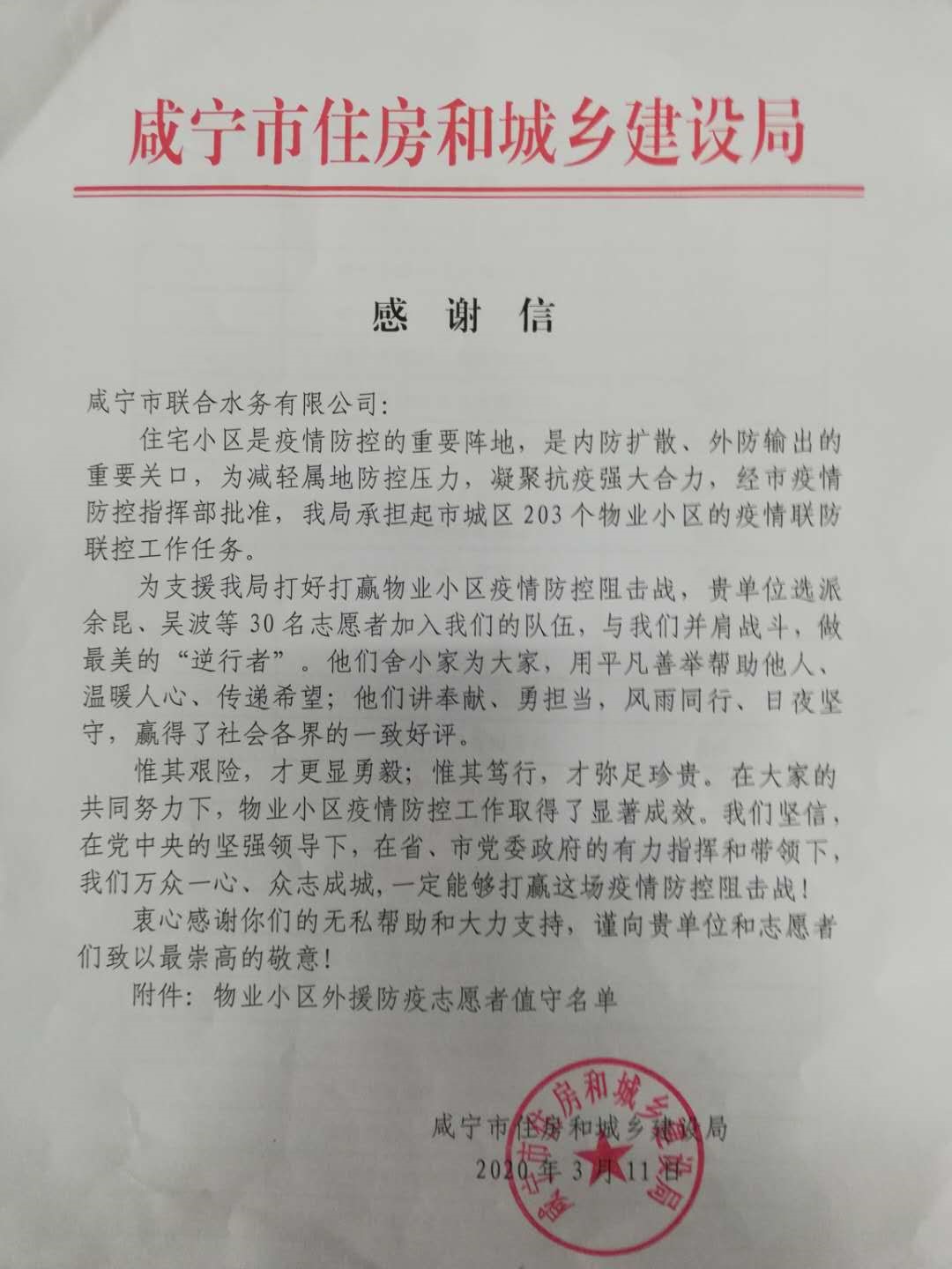 [ 咸寧市住建局致咸寧聯(lián)合水務(wù)的感謝信 ] 黃沙百戰(zhàn)穿金甲,不破樓蘭終不還。目前正處于新冠肺炎疫情防控的關(guān)鍵時(shí)期,一切向好,但一刻也不能放松警惕。同心同德共戰(zhàn)“疫”,全情全力保民生,興水務(wù),惠民生,潤澤萬家。聯(lián)合水務(wù)集團(tuán)仍將緊跟政府“全國一盤棋”的步伐,在保障員工安全的同時(shí),不忘初心,砥礪前行,千方百計(jì)做好供水保障,確保污水達(dá)標(biāo)排放,與全國人民一道,并肩作戰(zhàn),共同迎接春暖花開,國泰民安。