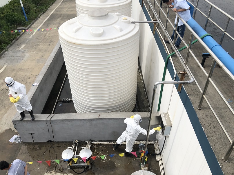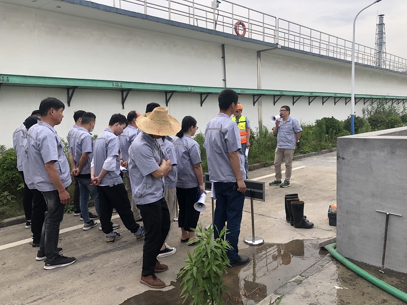 圖2:桐鄉申和水務有限公司總經理沈建新演練現場發言 演習場地設置在三期冰醋酸加藥儲罐旁,某員工經過儲罐旁時發現“冰醋酸”泄漏,污染地面。在初步查看后,第一時間按照程序向上級進行匯報。總指揮接到救援電話后,立即向各級應急行動組組長下達了應急救援命令。各小組接到指示后,分工明確,響應迅速。 綜合協調組立即在事故現場拉起了警戒線,組織疏散無關人員,確保事故處理線路通暢;物資調度組負責準備、調集搶險物資,第一時間將需要物資送往現場;信息發布組負責將信息報告給相關部門,對網絡上的不實報道予以澄清;專業救援組身穿防化服到達現場后,進入模擬區對冰醋酸儲罐泄漏點進行封堵,將泄漏冰醋酸進行有效收集,對圍堰地面進行清洗;環境保護組及時關閉雨水井截止閥防止污染物流入雨水管,并對雨水管網進行布點監測。