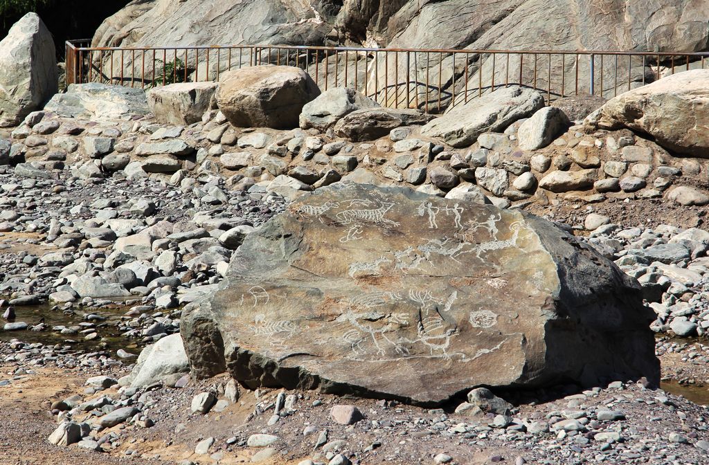 噠噠的馬蹄,穿過碧血黃沙,來到巨壁聳峙的山口,在巍峨絕嶺的腳下,一條中華民族的母親河自上游奔騰而下,轉(zhuǎn)過中寧,開始變得溫柔起來。在這里,游牧文明遇見了沃野千里,而文明在交融與衍化中,賦予這片土地一個(gè)狂野而輕靈的名字:賀蘭。 “賀蘭”一詞,是匈奴一只部落賀賴種的音轉(zhuǎn)。最早見于《晉書·北狄匈奴傳》。據(jù)記載,公元284年到287年,西晉太康五年到太康八年,由塞北進(jìn)入內(nèi)地降附的匈奴人共分三批約有十三萬(wàn)余人,《晉書》記載說:匈奴之類,總謂之北狄。北狄以部落為類,其入居塞者有屠各種、鮮支種、寇頭種……十九種,其中之一便是“賀賴種”。 在古代,賀蘭有著極其重要的邊防地位,不僅是幾大朝代的的西北門戶,也是西夏王朝賴以發(fā)展的寶庫(kù)。它地處我國(guó)農(nóng)耕民族和游牧民族的交接地帶,民族遷移十分頻繁,在歷史上是游牧民族通往中原地區(qū)的重要屏障,被譽(yù)為"朔方之保障,沙漠之咽喉"。眾多的谷口平時(shí)是貿(mào)易交通要道,戰(zhàn)時(shí)就是兵家必爭(zhēng)之地。唐代詩(shī)人王維有詩(shī)寫到:"賀蘭山下陣如云,羽樹交馳日夕聞。"以"陣如云"、"羽榭交馳"形象地描繪了激烈的戰(zhàn)爭(zhēng)場(chǎng)面。雄偉的賀蘭山,巍巍向西看,她高瞻遠(yuǎn)矚,傲視蒼穹;放眼廣闊無(wú)垠的蒙古高原,面對(duì)強(qiáng)勁冷酷的凜冽北風(fēng),迎擊西伯利亞的滾滾寒流,不屈不撓,英勇抗掙,頑強(qiáng)向上。她像馳騁沙場(chǎng)的將軍,更像祖國(guó)母親的赤子,捍衛(wèi)著祖國(guó)的邊防,保衛(wèi)著人民的安祥。 賀蘭也曾經(jīng)是匈奴、鮮卑、突厥、回鶻、吐蕃、黨項(xiàng)等北方少數(shù)民族駐牧游獵、生息繁衍的地方。他們把生產(chǎn)生活的場(chǎng)景,鑿刻在賀蘭山的巖石上,來表現(xiàn)對(duì)美好生活的向往與追求,再現(xiàn)了他們當(dāng)時(shí)的審美觀、社會(huì)習(xí)俗和生活情趣。在南北長(zhǎng)200多公里的賀蘭山腹地,就有20多處遺存巖畫。其中最具有代表性的是賀蘭口巖畫。賀蘭口距銀川城50余公里,位于賀蘭山中段的賀蘭縣金山鄉(xiāng)境內(nèi),山勢(shì)高峻,海拔1448米,俗稱“豁了口”。山口景色幽雅,奇峰疊障,潺潺泉水從溝內(nèi)流出,約有千余幅個(gè)體圖形的巖畫分布在溝谷兩側(cè)綿延600多米的山巖石壁上。畫面藝術(shù)造型粗獷渾厚,構(gòu)圖樸實(shí),姿態(tài)自然,寫實(shí)性較強(qiáng)。以人首像為主的占總數(shù)的一半以上。其次為牛、馬、驢、鹿、鳥、狼等動(dòng)物圖形。人首像畫面簡(jiǎn)單、奇異,有的人首長(zhǎng)著犄角,有的插著羽毛,有的戴尖形或圓頂帽。表現(xiàn)女性的巖畫,有的戴著頭飾,有的挽著發(fā)髻,風(fēng)姿秀逸,再現(xiàn)了幾千年前古代婦女對(duì)美的追求。有的大耳高鼻滿臉生毛,有的口銜骨頭,有的面部有條形紋或弧形紋。動(dòng)物圖形構(gòu)圖粗獷,形象生動(dòng),栩栩如生。有奔跑的鹿,有雙角突出的巖羊,有飛馳的駿馬,有搖尾巴的狗,有飛鳥的圖形和猛獸的形象,有部分人的手和太陽(yáng)的畫面,還有原始宗教活動(dòng)的場(chǎng)面。