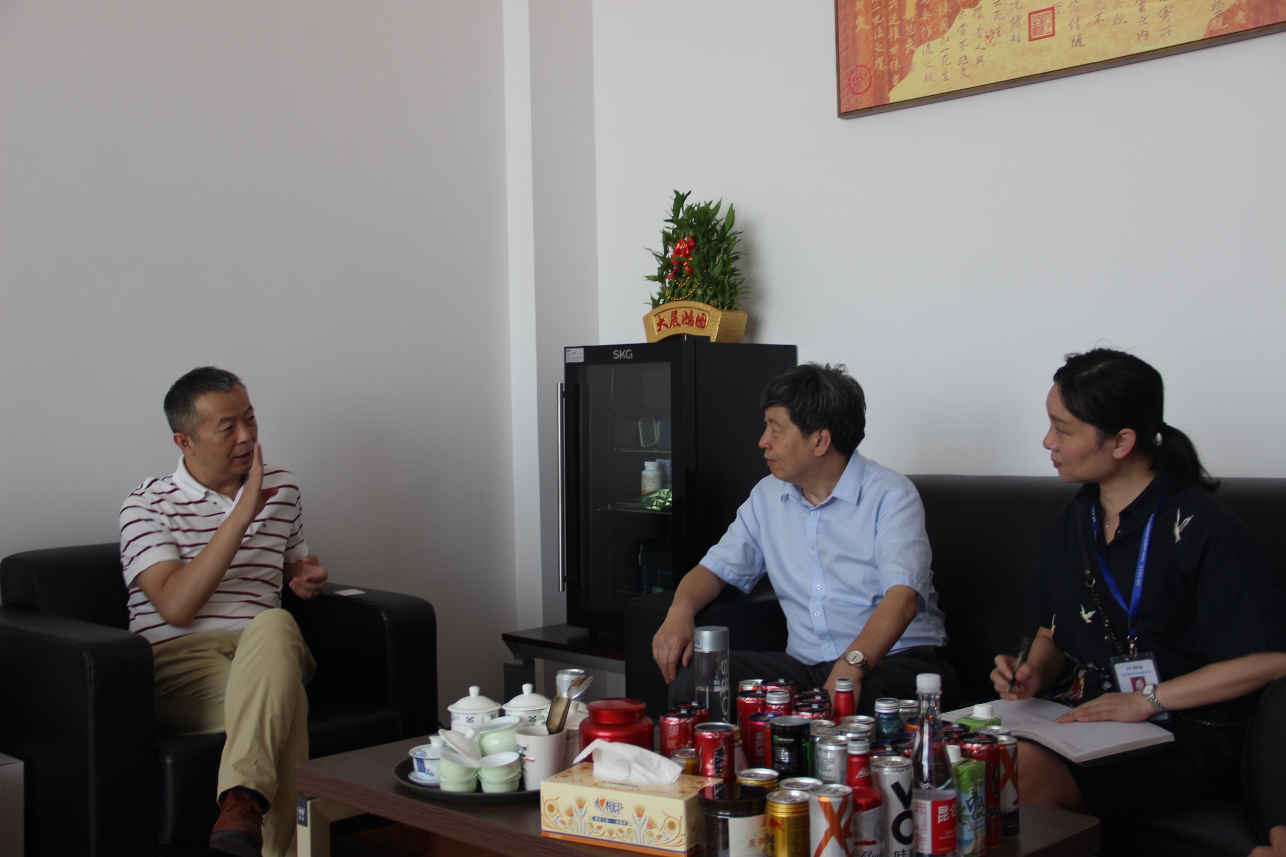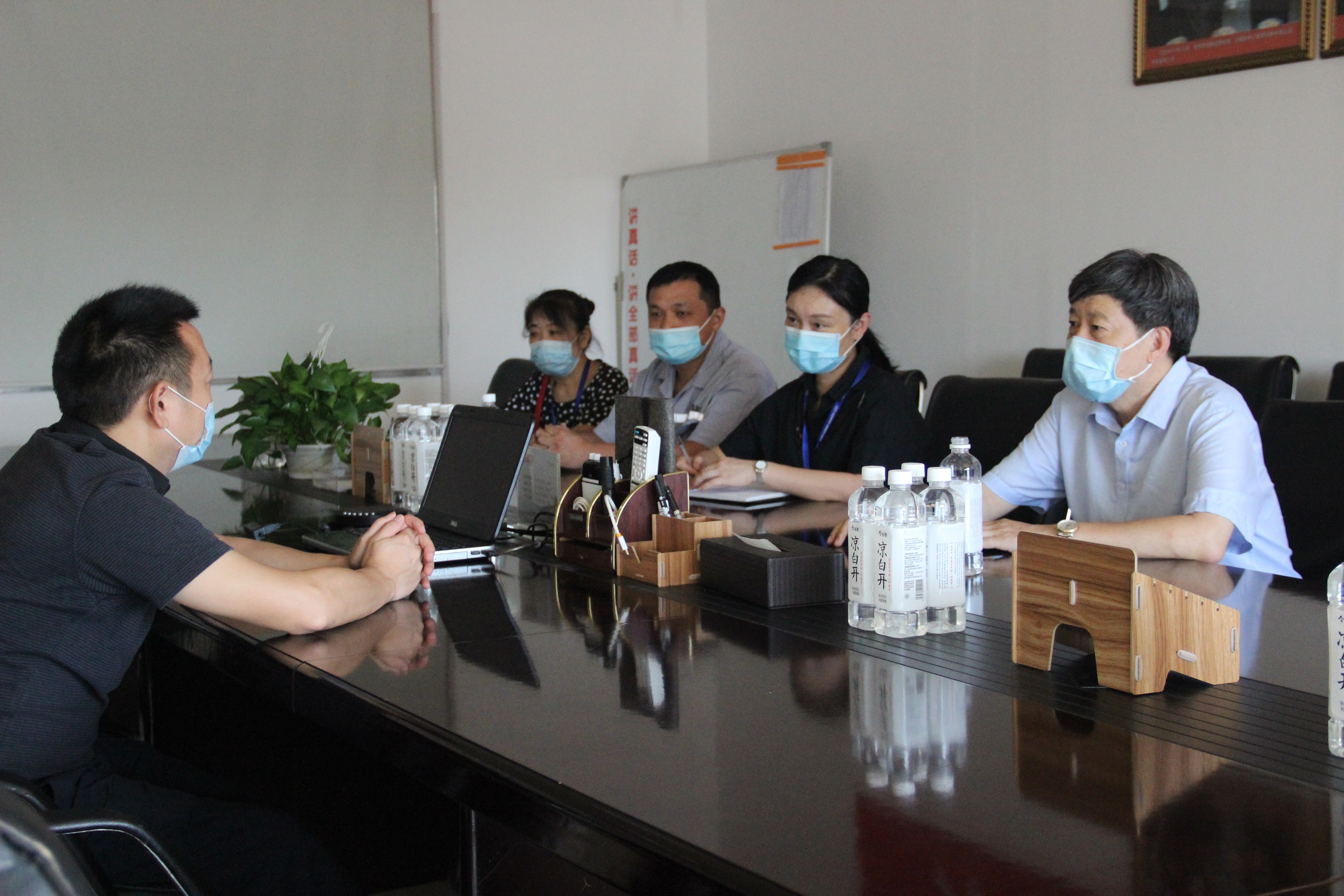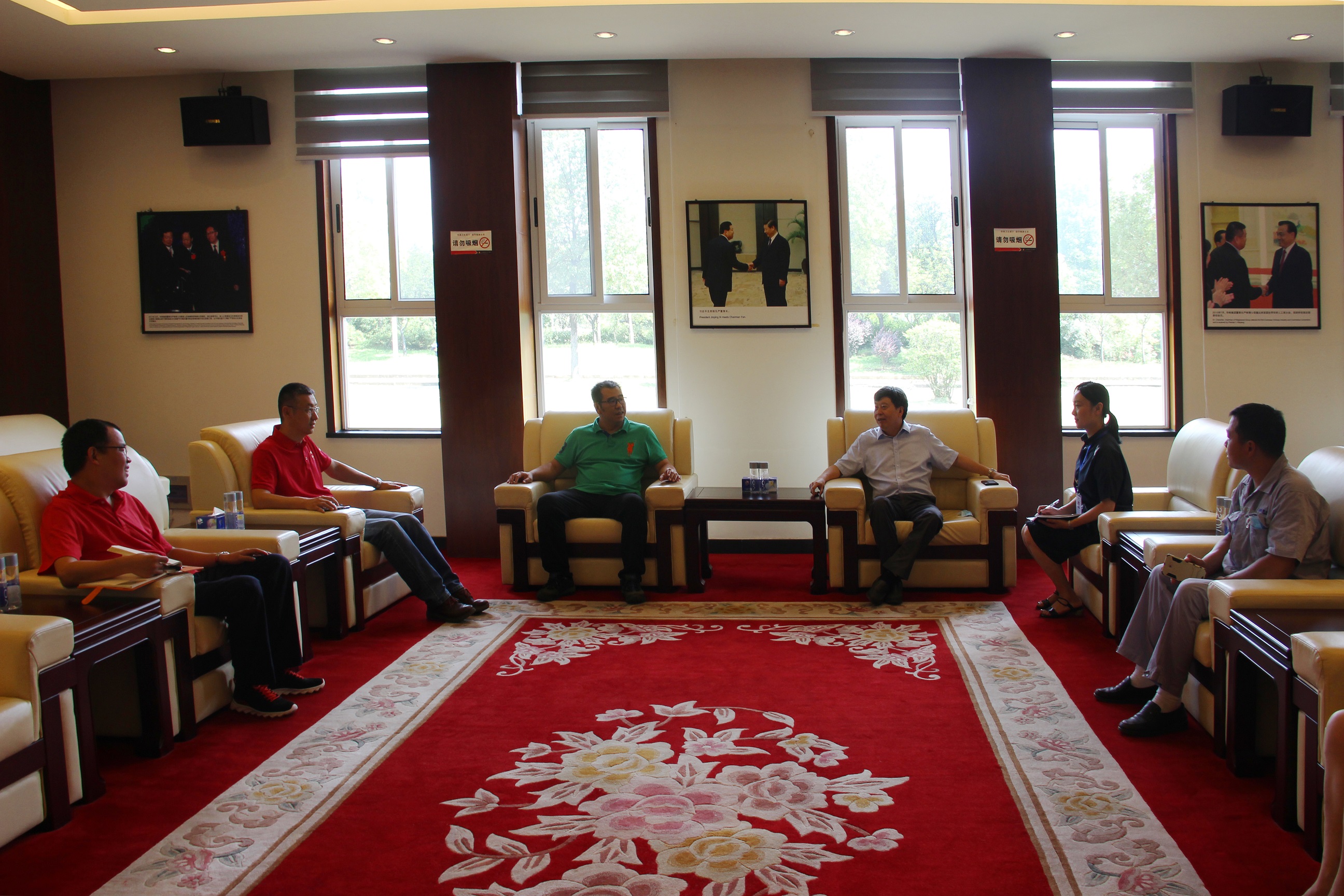 圖3:走訪奧瑞金企業(yè) 冒著炎炎烈日,毛總一行來到奧瑞金,與總經(jīng)理于仙超進行了親切洽談。奧瑞金雖然是近幾年才落戶咸寧發(fā)展,但是作為一家飲料公司,對水質(zhì)的要求非常嚴格,值得欣喜的是咸寧聯(lián)合水務(wù)的水質(zhì)完全能滿足公司要求,無論是水量或是水壓,都可滿足平時生產(chǎn)需要。在談到對供水服務(wù)工作有何建議時,于總說,企業(yè)的發(fā)展壯大并非一日之功,與聯(lián)合水務(wù)的合作非常愉快,希望聯(lián)合水務(wù)能持續(xù)保持現(xiàn)在的高標準、嚴要求的供水態(tài)度,為確保企業(yè)發(fā)展提供堅實后盾。