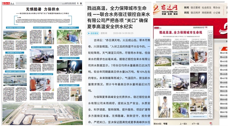 圖為《宿遷日報》、“速新聞”、“宿遷網”刊登宣傳 制作高峰供水電視宣傳片,加深用戶直觀感受。今年的高峰供水宣傳增添了一大亮點,即由地方電視臺節目組深入供水一線錄制、播出宣傳。經過長時間籌劃、宣傳片腳本的反復修訂、領導審核,歷時一個多月,公司高峰供水宣傳片在宿遷綜合頻道、公共頻道播出,引起了很大反響。電視節目的播出,將供水的工作場景直觀展現在用戶面前,充分體現了供水人不畏酷暑、力保供水的可貴精神,獲得社會高度認可。