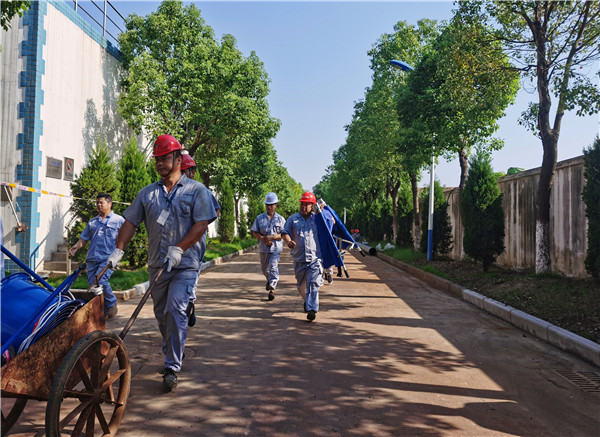 圖1:應急演練現場--救援小組現場救援 8月27日上午9時許,應急演練正式開始。因生產部運行工在有限空間的1#加藥間加藥池內清理藥劑殘留物時違章操作,導致中毒昏倒,隨行操作人員發現后初步判斷,有限空間作業區域內可能存在有毒有害氣體導致運行工重度昏迷,不敢貿然進入,立即向公司安全生產總指揮匯報情況。