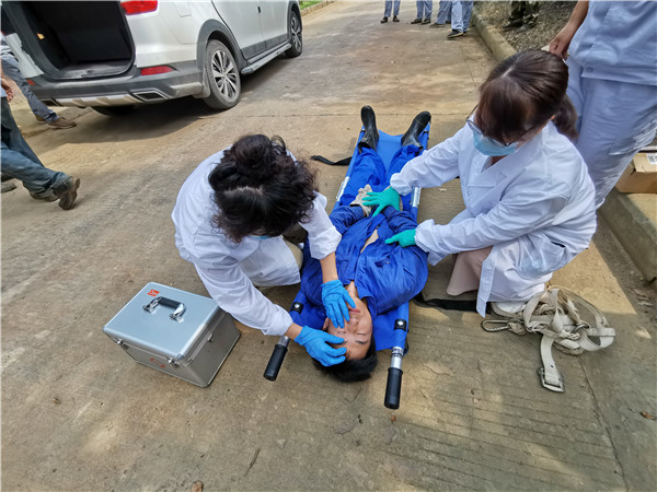 圖2:應急演練現場--醫護人員查看傷員情況 總指揮迅即趕到事故地點統籌指揮,應急小組多措并舉,疏散現場閑雜人員、布置警戒線、通知救援小組展開救護工作、撥打120急救電話,各項工作緊張而有序開展。救援隊長了解事故大致情況后,安排人員在現場安裝大功率通風設備進行通風處理,并開展初期救援,2分鐘后,公司專業救援人員佩戴便攜式防毒面具、安全帶,攜帶檢測儀器、對講機,連接救生索,入池檢測氣體濃度,評估下池救援的可行性。在確認可以施救的情況下,將傷員轉移至池外通風空曠處,隨即按標準心肺復蘇手法實施搶救,直至120救護車趕到。專業醫護人員查看傷員情況后將其轉移至救護車上,送往醫院搶救治療。至此,經過精心策劃、周密安排的應急演練圓滿落下帷幕。
