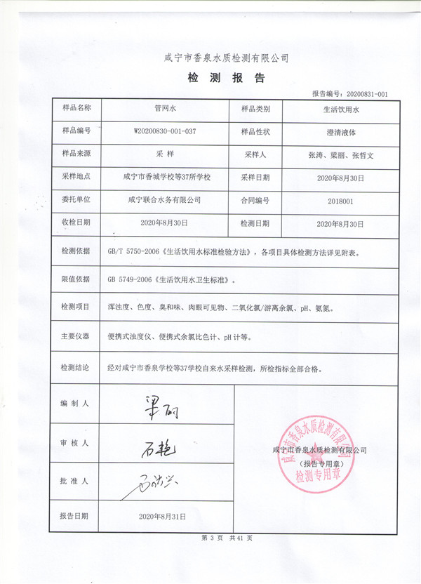 圖:城區37所學校水質檢測報告 本次被檢測的37所學校,現場檢測渾濁度和游離余氯(二氧化氯)指標均合格,帶回實驗室檢測的項目,色度均≤5鉑鈷色度單位,無異臭、異味,pH值和氨氮指標均符合國家標準。 咸寧市香泉水質檢測有限公司負責人說:“經過對采集的水樣檢測,咸寧城區由聯合水務供水的37所學校,水質符合《生活飲用水衛生標準》GB 5749-2006國家標準及相關要求,可放心飲用”。 專業精細 保證檢測結果精準權威 今年由于新冠肺炎疫情影響,我市學校自來水已有大半年時間未正常使用,水管內多少會積攢未流通的“死水”。為確保本次開學季校園水質檢測結果精準,咸寧聯合水務校園水質采樣專班人員,每到一所學校都會在學校食堂、宿舍水龍頭和消防栓前駐足許久,將自來水龍頭打開后,至少放水5-10分鐘才將自來水采樣或現場檢測。 盡管驕陽似火,但工作人員卻一絲不茍。為確保高效完成本次檢測任務,校園水質采樣專班在水質采集成功后,第一時間送往咸寧市香泉水質檢測有限公司,分區作戰、多組協同,做到應檢盡檢,不漏一校。 香泉水檢公司將送達的水樣連夜開展檢測,檢測人員繃緊每一根神經,不同校區和不同采水點的量杯,都需認真做好標記;每一個參數和指標都要仔細反復地觀察、檢測,只有做到謹小慎微,才可保證檢測結果準確無誤。 據悉,香泉水檢公司是咸寧市生活飲用水水質檢測能力最強的專業檢測機構。具有生活飲用水106項中94個項目檢測能力,取得資質的水質參數達101項,作為湖北省城市供水水質監測網成員單位,其飲用水檢測能力處于湖北省供水行業第二位。本次被測37所學校,香泉水質檢測公司統一出具權威性的水質檢測報告。 上門納諫 踐行“店小二”服務精神 上門納諫提升服務,踐行“店小二”服務精神。除了對水質進行采集和檢測,咸寧聯合水務組織二次供水運營部,積極主動與各學校對接,將《關于我市開學前學校用水安全溫馨提示》送到學校,并對學校的供水設施進行檢查、維護。