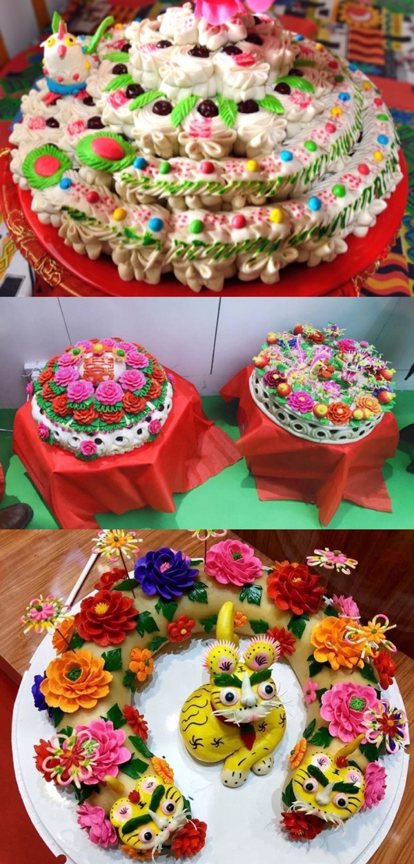 古絳州,今天的新絳縣,一直是山西省重要的小麥、棉花產地。麥收時節,家家戶戶收麥、晾曬,用上等的小麥磨成面粉。每逢年歲時節、絳州民間面塑形態各異、花色絢麗,又被當地人稱為“花饃”。因民俗而出現的面塑則代代相傳、生生不息,經過幾千年的傳承和經營,成為中國傳統文化和民間藝術的一部分。春節,講究“大門獅子二門狗”,寓意鎮宅保平安;水缸旁放“雙頭魚”,寓意連年有余;糧倉放牛拉車和麥囤,寓意糧倉滿溢、日子越過越景氣;天地爺處祭棗山花饃、豬羊饃、節節高饃,寓意殺豬宰羊、生活一年比一年好;財神爺處祭元寶棗籃饃,寓意招財進寶。清明時節,要捏豬頭饃、刺魚饃等祭祖掃墓,刺饃還得在墳頭滾一滾,意為已故祖先撓癢癢,盡兒孫之孝。端午節,要捏老虎饃,“虎鎮五毒”,寓意去災辟邪。婚禮上,要捏龍鳳糕,插柏葉,紅繩系核桃、紅棗、花生、石榴、寓意夫妻百年好合、發家致富、生兒育女。新生兒滿月時,要蒸各式各樣的花、果造型的花饃、寓意開花結果。壽誕時、兒女要為長輩蒸壽桃饃。為母親拜壽時,插一組“七仙女拜壽”,為父親拜壽時,插一組“八仙慶壽”,顯示兒女孝心。在這片土地上,自漢代以來流傳千年的捏花饃風俗,早已深深融入絳州人們生活的方方面面。只要有誰家遇上紅白事,鄰居、親戚都會聚集在一起幫忙蒸制花饃。