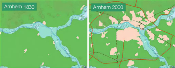 備注:圖片來源于網絡 奈梅亨(Nijmegen)退堤工程位置位于瓦爾河(Waal River),是河流從德國至荷蘭境內后的關鍵節點,敏感性極高,城市發展不斷擠壓河道生存空間,加劇了洪水與城市之間的緊張關系。