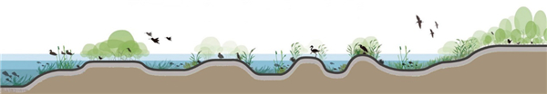 備注:水生植物對氮和有機質的去除機制 魚蝦螺貝等水生動物也是修復過程中必不可少的一環。其凈化機理分為直接和間接兩種:一、水生動物通過攝食水體中有機懸浮物、藻類及植物腐敗殘體等方式,直接削減水體中富營養物質;二、水生動物通過攝食或其分泌物的天然絮凝作用,提高水體透明度,增強沉水植物光合作用,間接促進植物對水體的凈化效果。 棲息地營造與恢復也是水生態修復的重要目的。通過微地形營造及草-灌木-喬木小生境的設計,可有效實現生物多樣性的恢復及棲息地的打造。如涉禽類主要于水深10-23 cm的空間內活動攝食,而游禽類主要于水深50-200 cm范圍內游憩活動,水深30 cm范圍內覓食,而不同的植被可為其提供產卵、棲息的隱蔽空間。