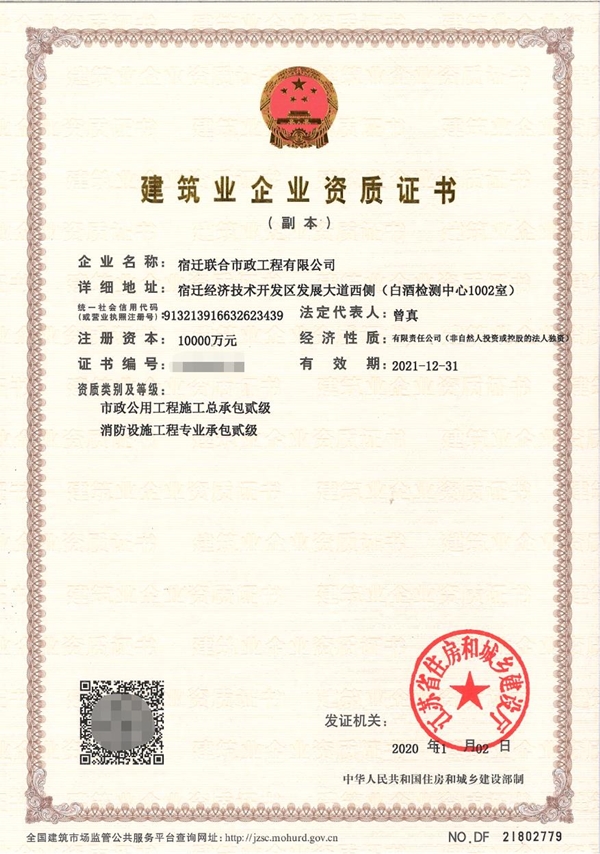 近日,宿遷聯(lián)合市政工程有限公司成功取得了新一期安全生產(chǎn)許可證,標(biāo)志著公司市政公用工程資質(zhì)證書延續(xù)換證工作圓滿完成。