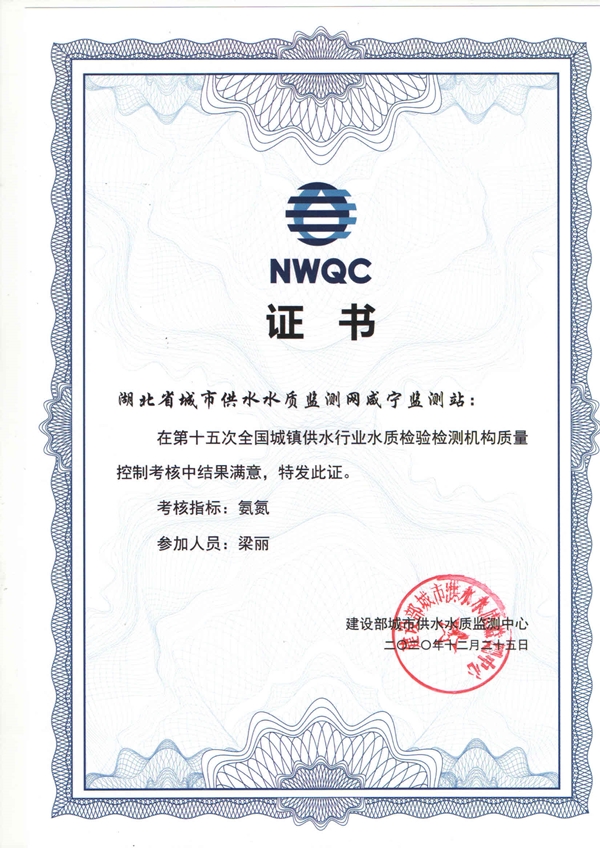為加強城鎮供水水質檢驗檢測機構的質量控制,促進檢測能力和管理水平提升,住建部城市供水水質監測中心于2020年組織開展《第15次全國城鎮供水行業檢驗檢測機構生活飲用水氨氮項目的質量控制考核》,香泉水檢公司暨湖北省城市供水水質監測網咸寧監測站報名參加了本次能力驗證活動。2020年9月2日,公司順利完成了氨氮能力驗證考核樣品檢測。近日,公司接到了住建部頒發的能力驗證結果通知書,順利通過本次水中氨氮項目的能力驗證,取得了“滿意”結果。