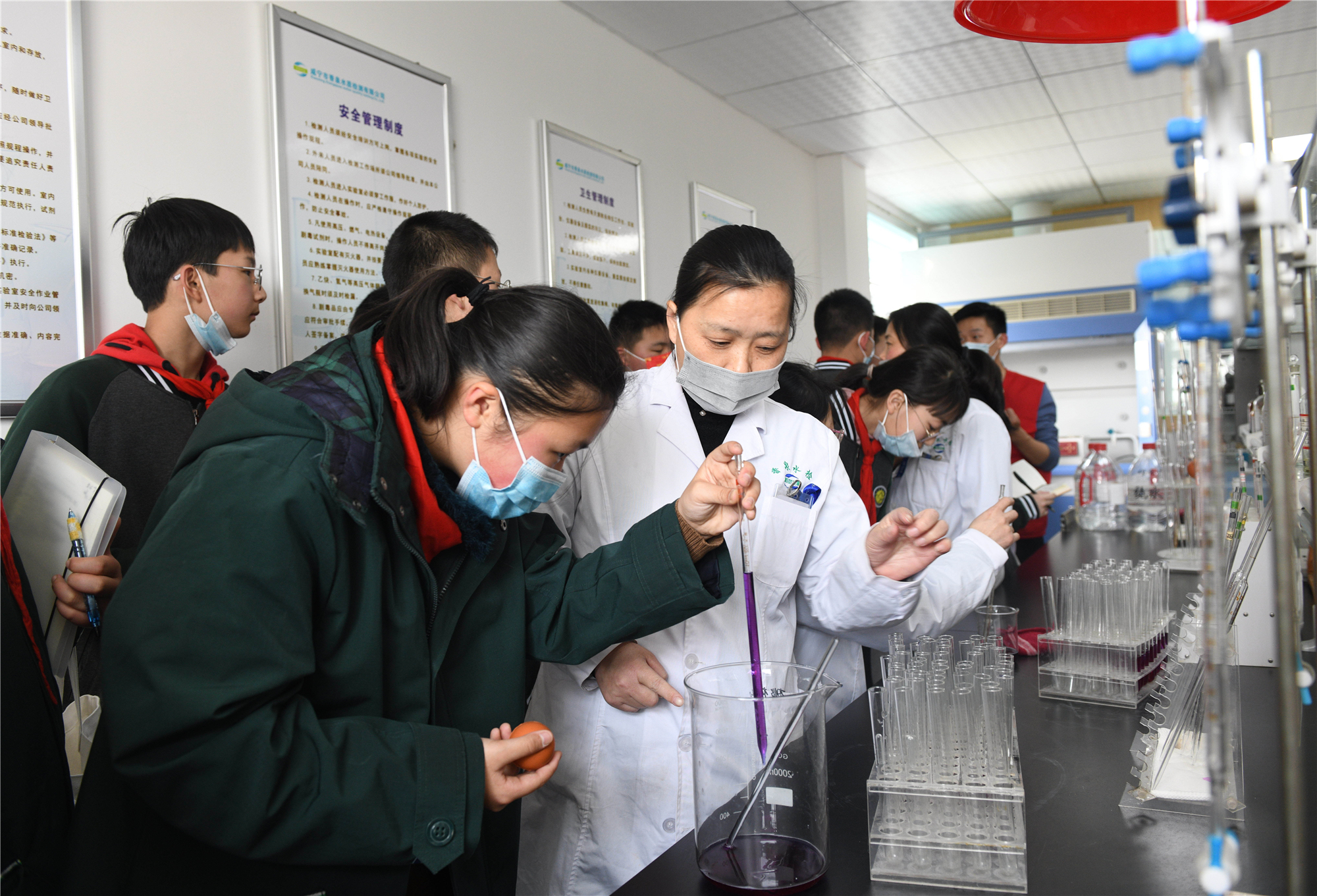 圖:參觀平流沉淀池 在參觀完制水工藝流程后,同學(xué)們來到了水質(zhì)檢測(cè)中心。工作人員介紹到,現(xiàn)階段公司擁有50多臺(tái)套檢測(cè)儀器設(shè)備,檢測(cè)項(xiàng)目達(dá)到100余項(xiàng),其檢測(cè)能力在湖北省位于第二名,為確保出廠的每一滴水都是達(dá)標(biāo)之水、優(yōu)質(zhì)之水,工作人員會(huì)每隔兩小時(shí)對(duì)出廠水進(jìn)行檢測(cè)一次,全力保障龍頭水源安全。