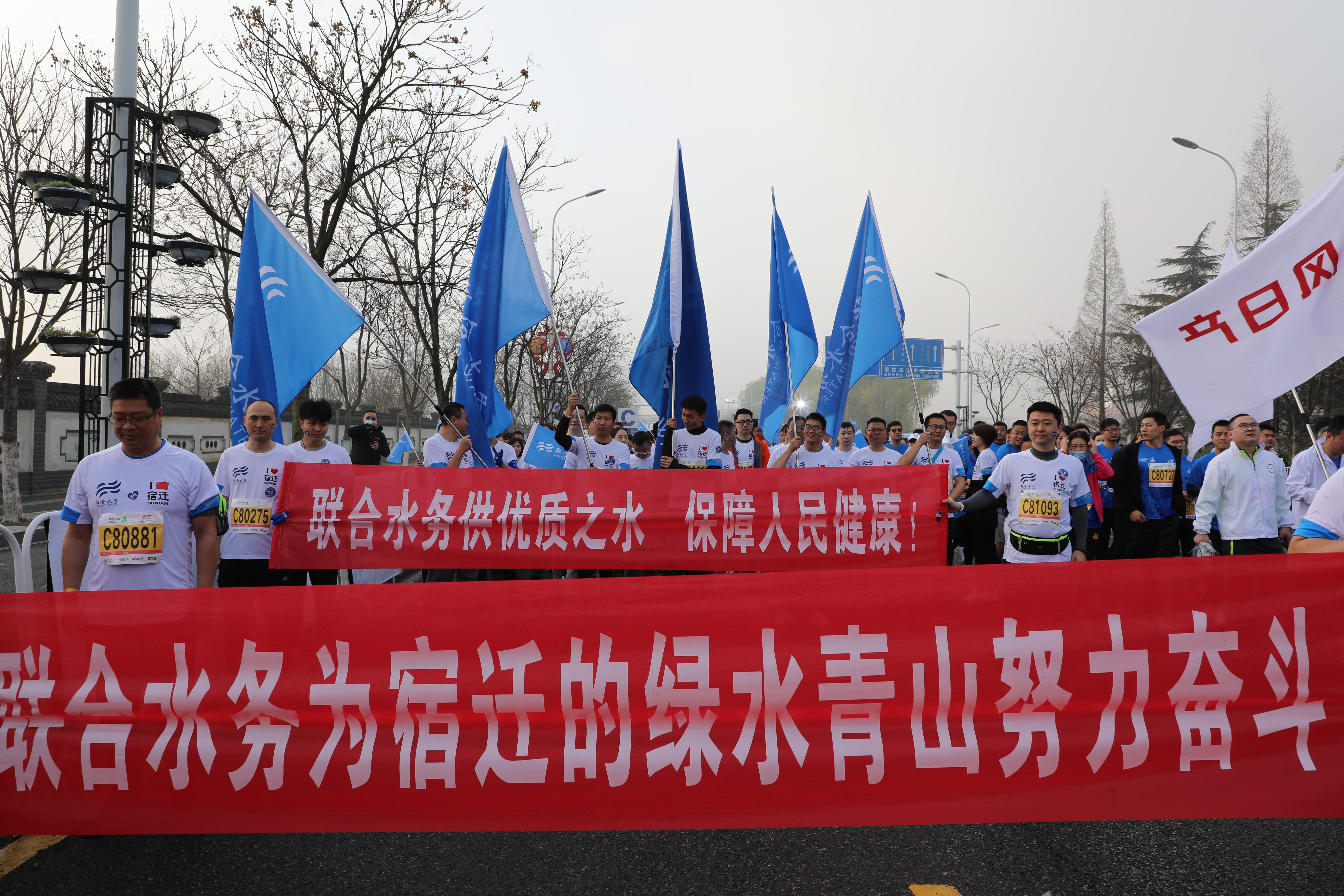 據了解,宿遷城市供水是聯合水務第一個投資項目,在宿遷市委市政府及主管部門指導、支持下,在集團總部大量財力、物力、人力助力下,經過多年發展,公司快速發展,能夠完全滿足宿遷市的供水需求,同時,代表宿遷市接受各類國家級、省級考核檢查,水助力全市供水營商環境連續兩年排名全省第二,供水滿意度連續兩年排名全省第二,并助力宿遷市連續兩次獲得“全省優秀供水城市”榮譽稱號。聯合水務以與城市共興共榮的理念,全力支持首屆“遷馬”的圓滿舉行。 “游項王故里,跑水韻名城,品中國酒都”。西楚霸王的英雄氣概、兩河兩湖的水韻柔情、醇厚綿柔的醉人酒香,早已讓萬名跑者心生向往。當天上午7時20分許,記者采訪了正在做熱身運動的陳樵。 “我是2014年開始跑馬拉松的,曾參加過柏林的馬拉松比賽,還參加過上海、北京、南京等地組織的馬拉松。以前,我的體重是150斤,現在120斤,心率降了很多。”陳樵告訴記者,這次馬拉松賽事辦得很好,宿遷也很美,希望以后能繼續來宿遷參賽。 當日上午7時30分,隨著一聲槍響,在集團高級副總裁劉猛的帶領下,五面印有聯合水務LOGO的藍色大旗氣宇軒昂地走在隊伍前面,和大家一起奔向勝利的終點。