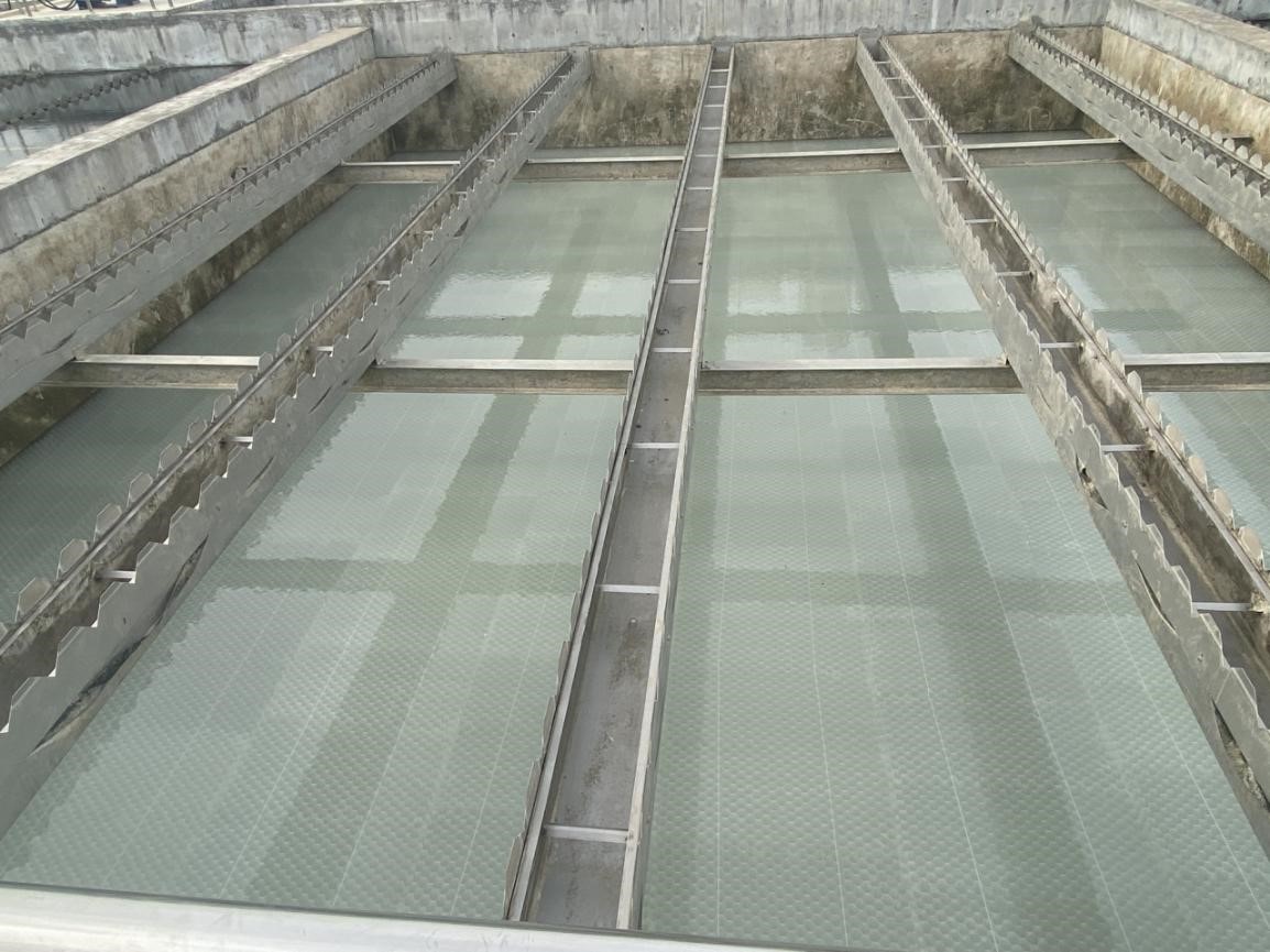 宿遷供水公司二水廠二期沉淀池自2013年建設至今,已經運行了8年,可謂是為宿遷人民的生活和宿遷經濟的發展立下了汗馬功勞,共計上億噸清澈的自來水在二期沉淀池中絮凝沉淀,得到凈化并進入千家萬戶。鑒于沉淀池內部分斜管破損存在影響出水水質的可能以及池頂玻璃鋼蓋板老化嚴重,制水部于四月底安排人員對二期A、B兩座沉淀池的斜管支架進行加固以防斜管塌陷,然后更換了新的斜管,并將二期沉淀池平臺整體的玻璃鋼蓋板換成既牢固又美觀的不銹鋼蓋板。