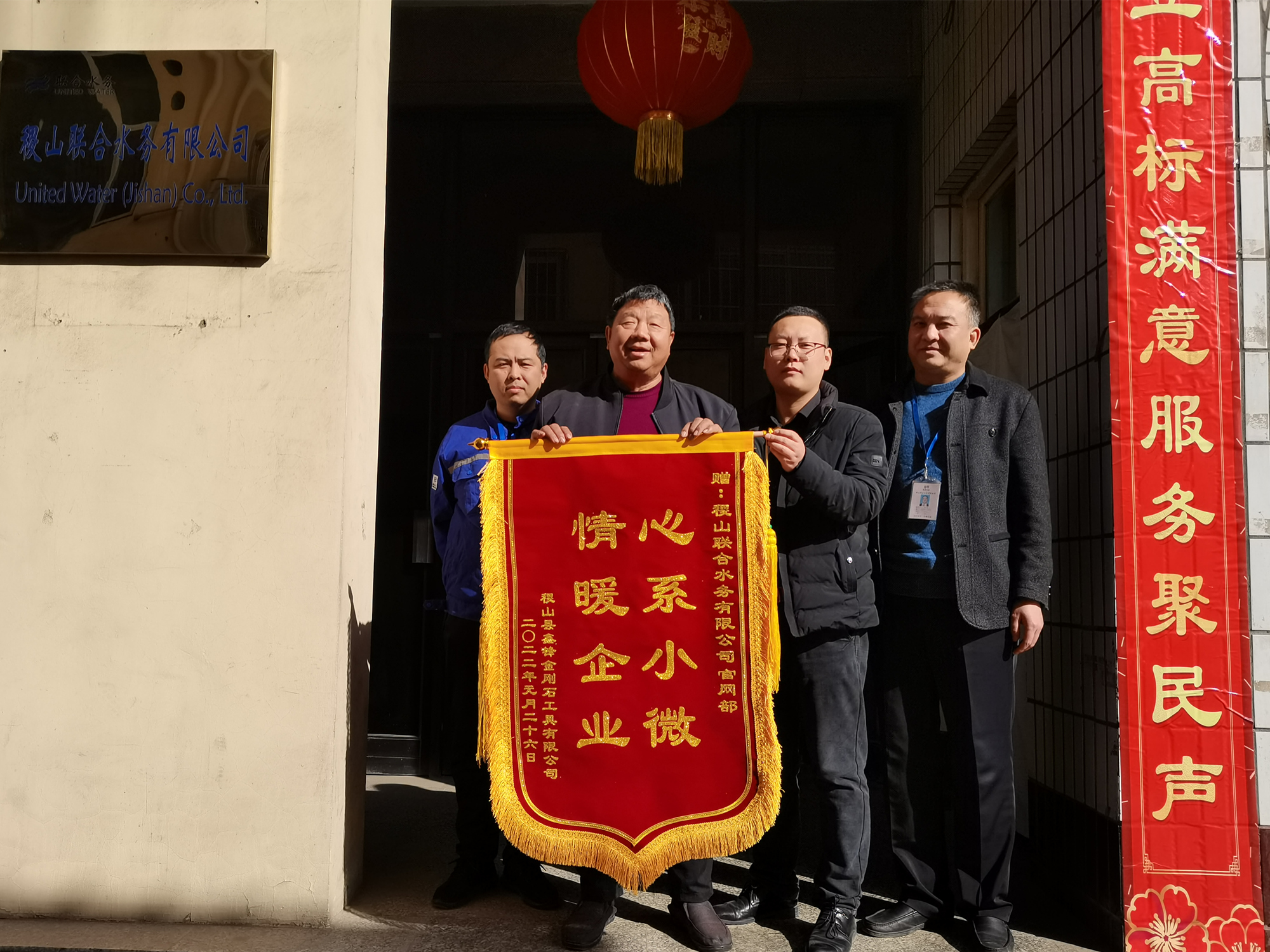 近日,稷山南城汽配廠及稷山縣鑫鋒金剛石工具有限公司的代表來到稷山聯合水務有限公司,分別送上兩面寫有“排憂解難辦實事,優質服務為用戶”、“心系小微,情暖企業”的致謝錦旗,并向稷山聯合水務表示衷心的感謝,對公司管網部高效解決用戶供水問題表示高度肯定。