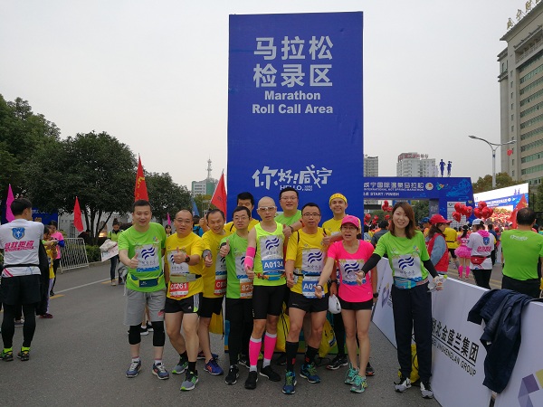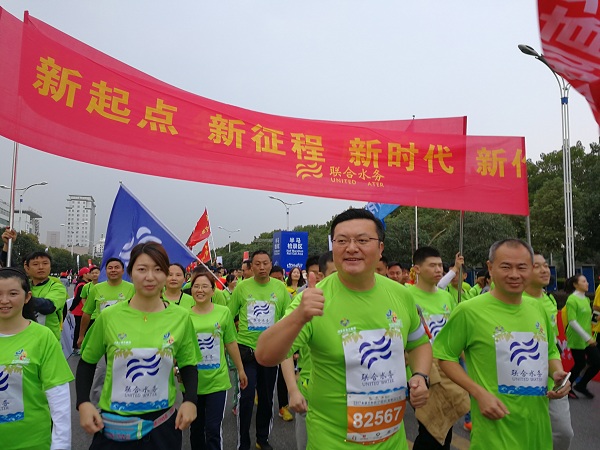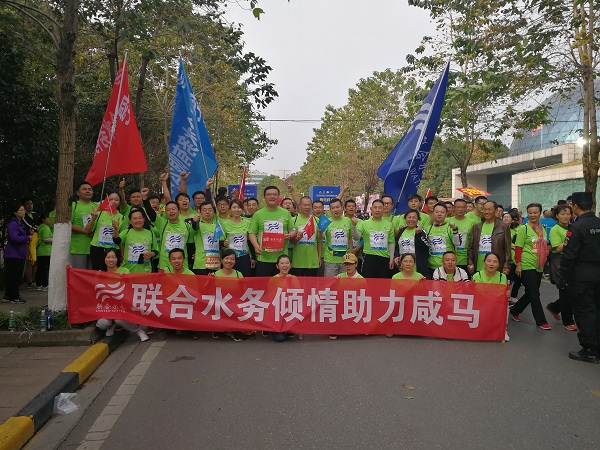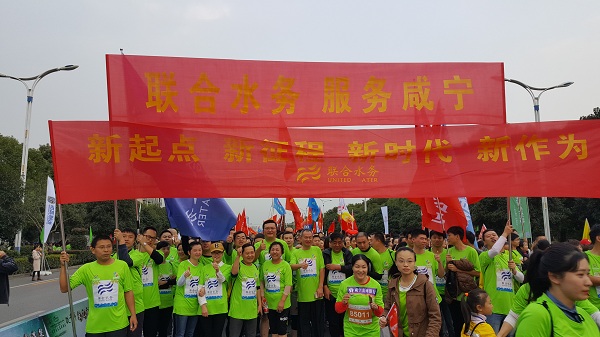 11月11日上午8點,2017年咸寧國際溫泉馬拉松賽在咸寧市人民廣場鳴槍開跑,本次活動吸引了全世界的1.2萬人參加,聯合水務集團副總裁劉猛、陳樵、James Beeson先生及旗下6個項目公司的63名參賽隊員匯集香城泉都,代表聯合水務傾情助力本次馬拉松大賽。 當天7:20,集團63名參賽人員和咸寧公司70名啦啦隊和服務人員,在起點人民廣場集中,高舉“新起點、新征程、新時代、新作為”、“聯合水務,服務咸寧”的橫幅,大家步伐整齊,揮舞彩旗,方陣格外引人注目,為本屆馬拉松賽事增添了一抹亮麗的風景。